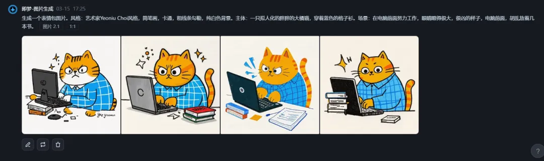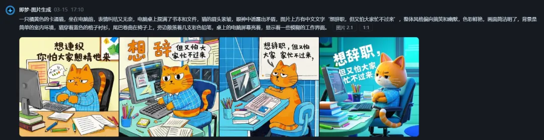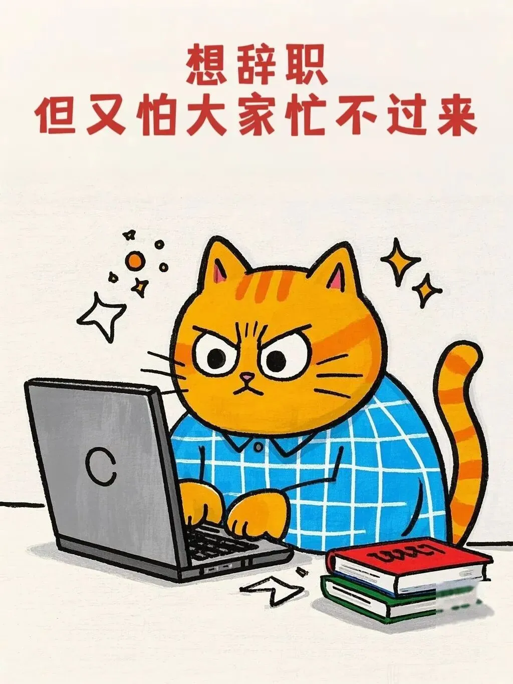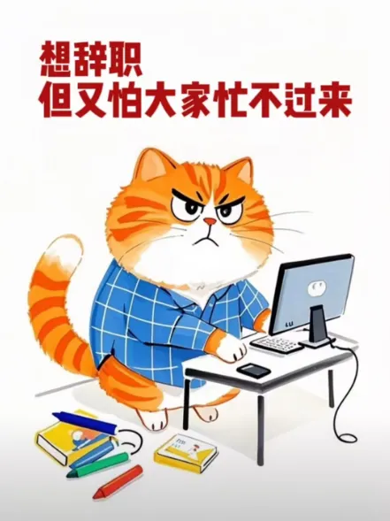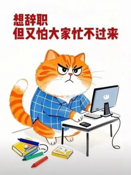 “一只橘黄色的卡通猫,坐在电脑前,表情纠结又无奈,电脑桌上摆满了书本和文件,猫的眉头紧皱,眼神中透露出矛盾,图片上方有中文文字’想辞职,但又怕大家忙不过来’,整体风格偏向搞笑和幽默,色彩鲜艳,画面简洁明了,背景是简单的室内环境,猫穿着蓝色的格子衬衫,尾巴卷曲在椅子上,旁边散落着几支彩色铅笔,桌上的电脑屏幕亮着,显示着一些模糊的工作界面。”