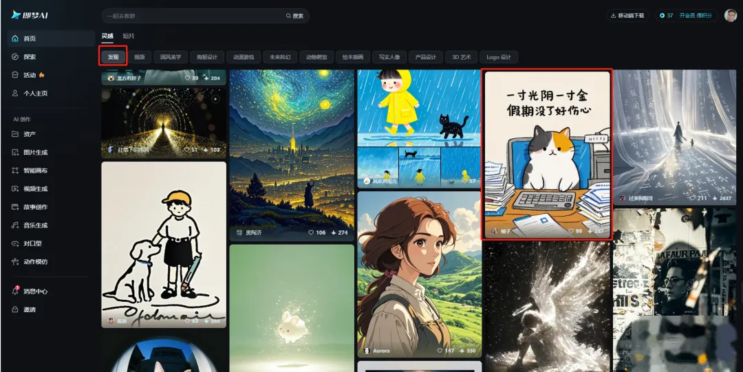 即梦AI首页的”发现”里有很多现成图片。
