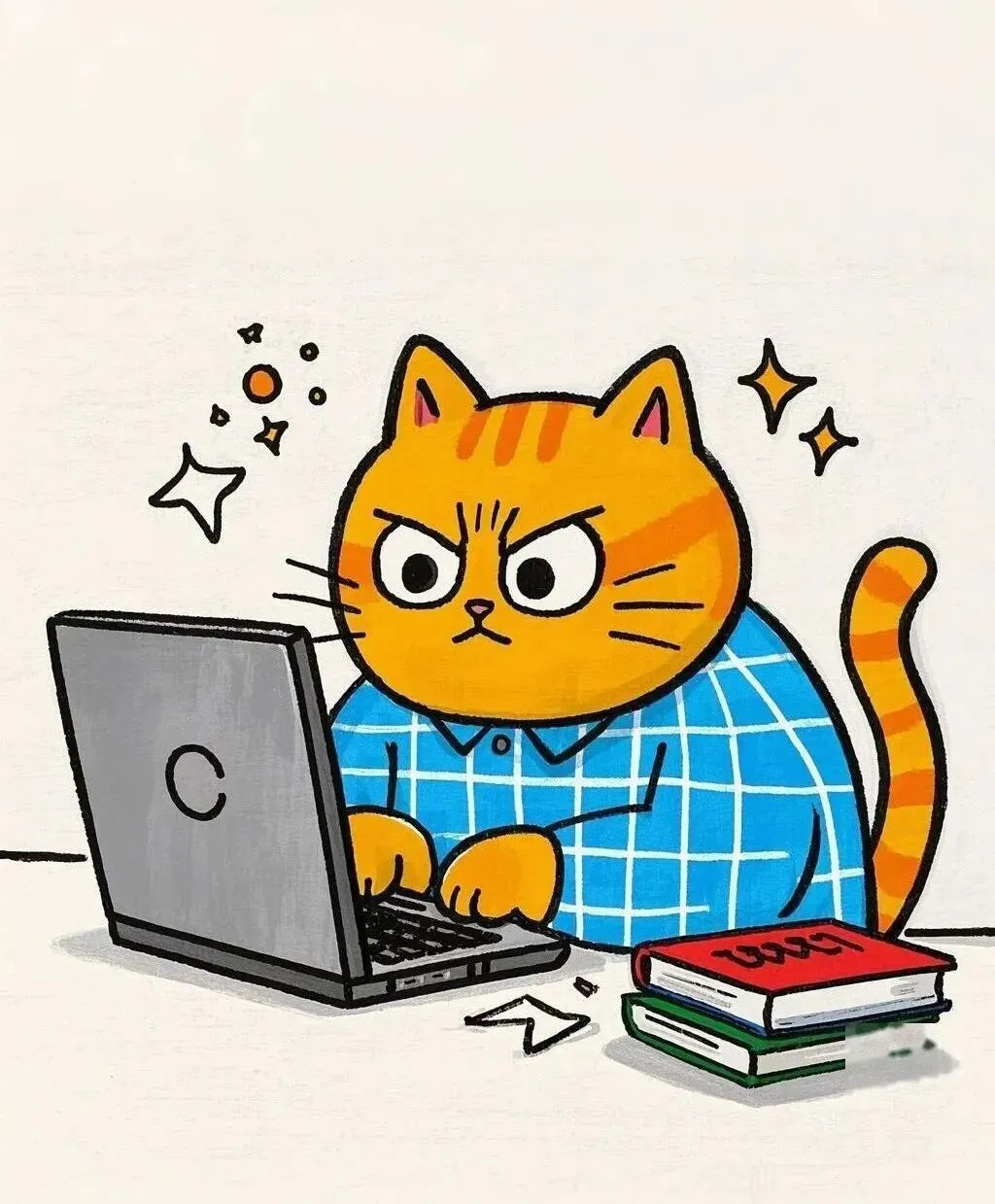场景:在电脑前面努力工作,眼睛瞪得很大,很凶的样子,电脑前面胡乱放着几本书
