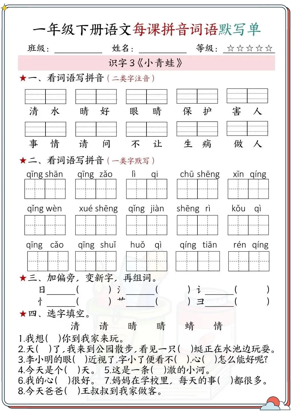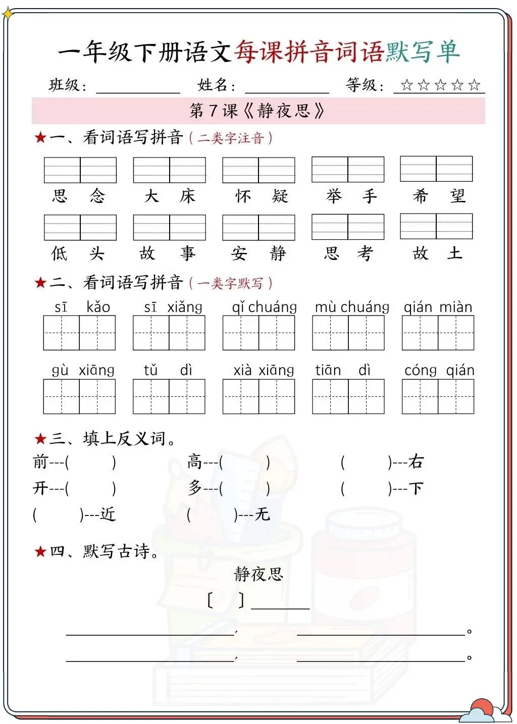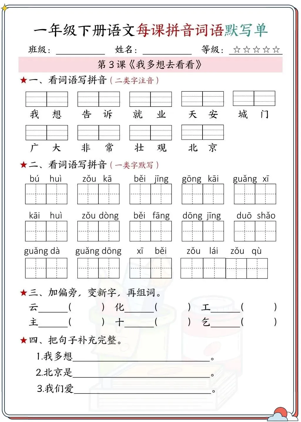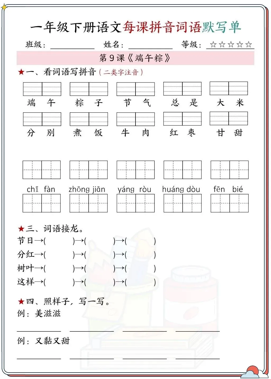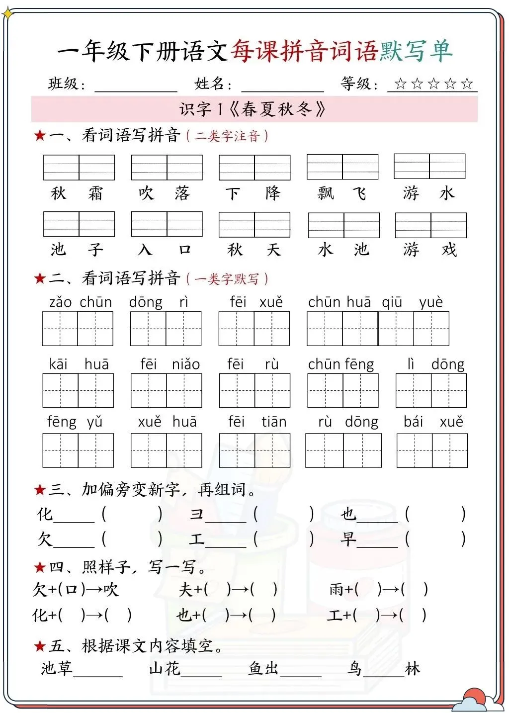 今天给大家整理了一年级下册语文全课拼音词语默写单,从《春夏秋冬》到《端午粽》,每课都按「二类字注音+一类字默写+偏旁组词+句式练习」设计,完全贴合课本进度,直接打印A4练习纸,每天10分钟高效巩固!这份默写单的核心亮点:✅ 全课同步:覆盖识字1-语文园地一、第2-9课所有重点字词✅ 分层练习:先认拼音再写词语,从基础到拓展循序渐进✅ 题型丰富:加偏旁组词、连词成句、古诗默写、词语接龙,全面锻炼语文能力 给娃的高效学习小建议:1. 每日10分钟:固定时间完成一课,避免突击刷题2. 错题复盘:用红笔标注易错拼音,第二天重点复习3. 趣味拓展:结合词语接龙、仿写句子,让练习不枯燥 拼音和字词是语文地基,这份默写单帮娃把基础打牢!