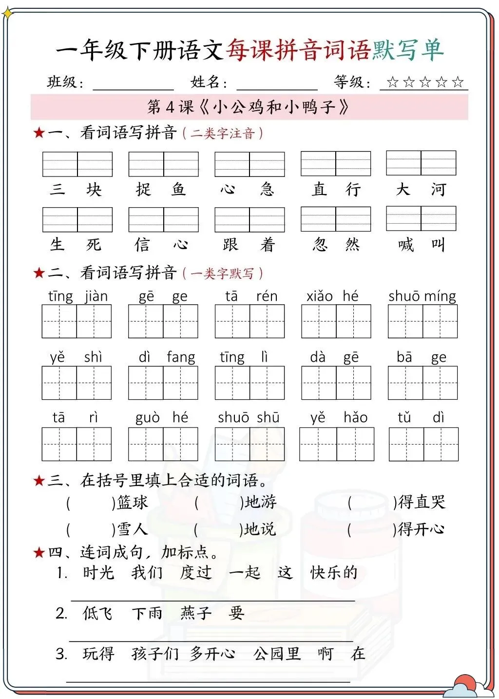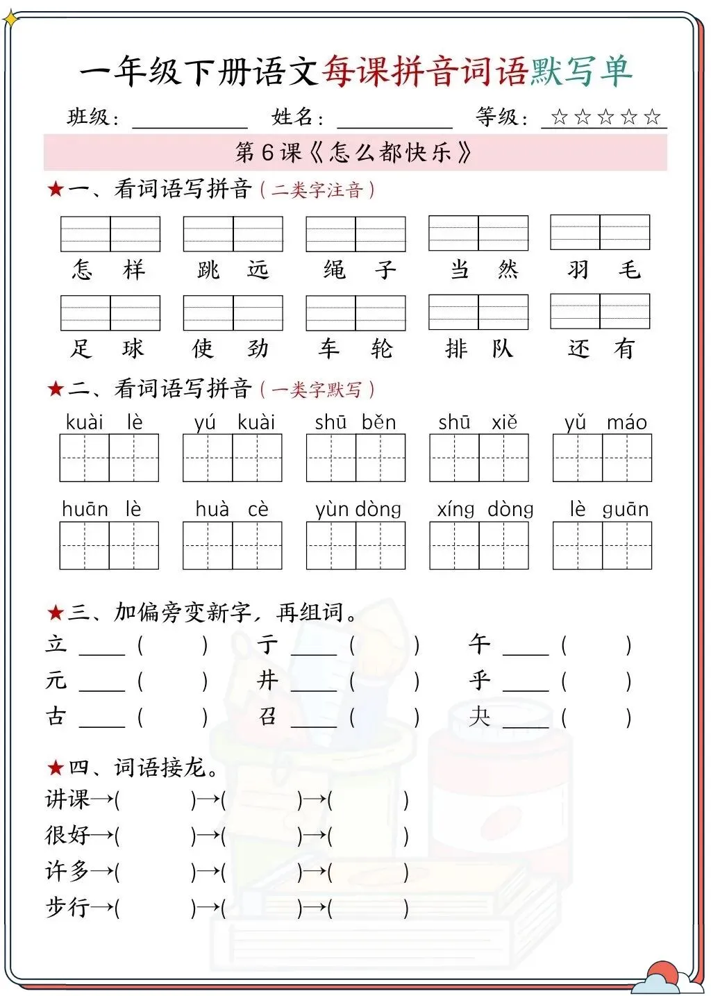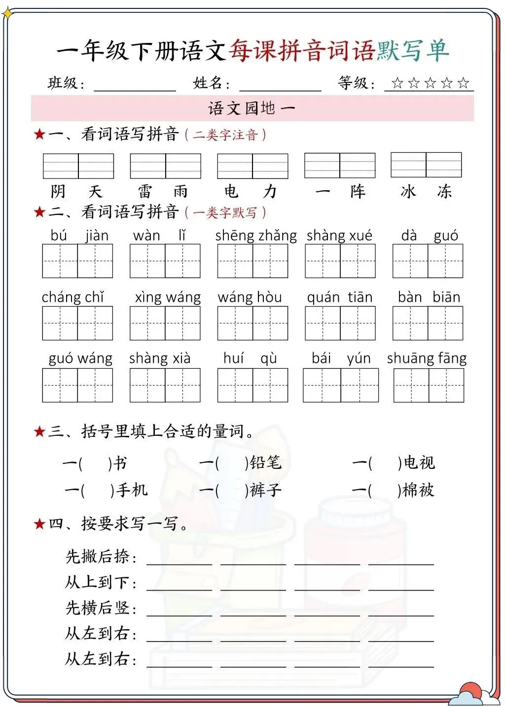 一年级下册语文拼音词语默写单|全课覆盖可打印-可打印