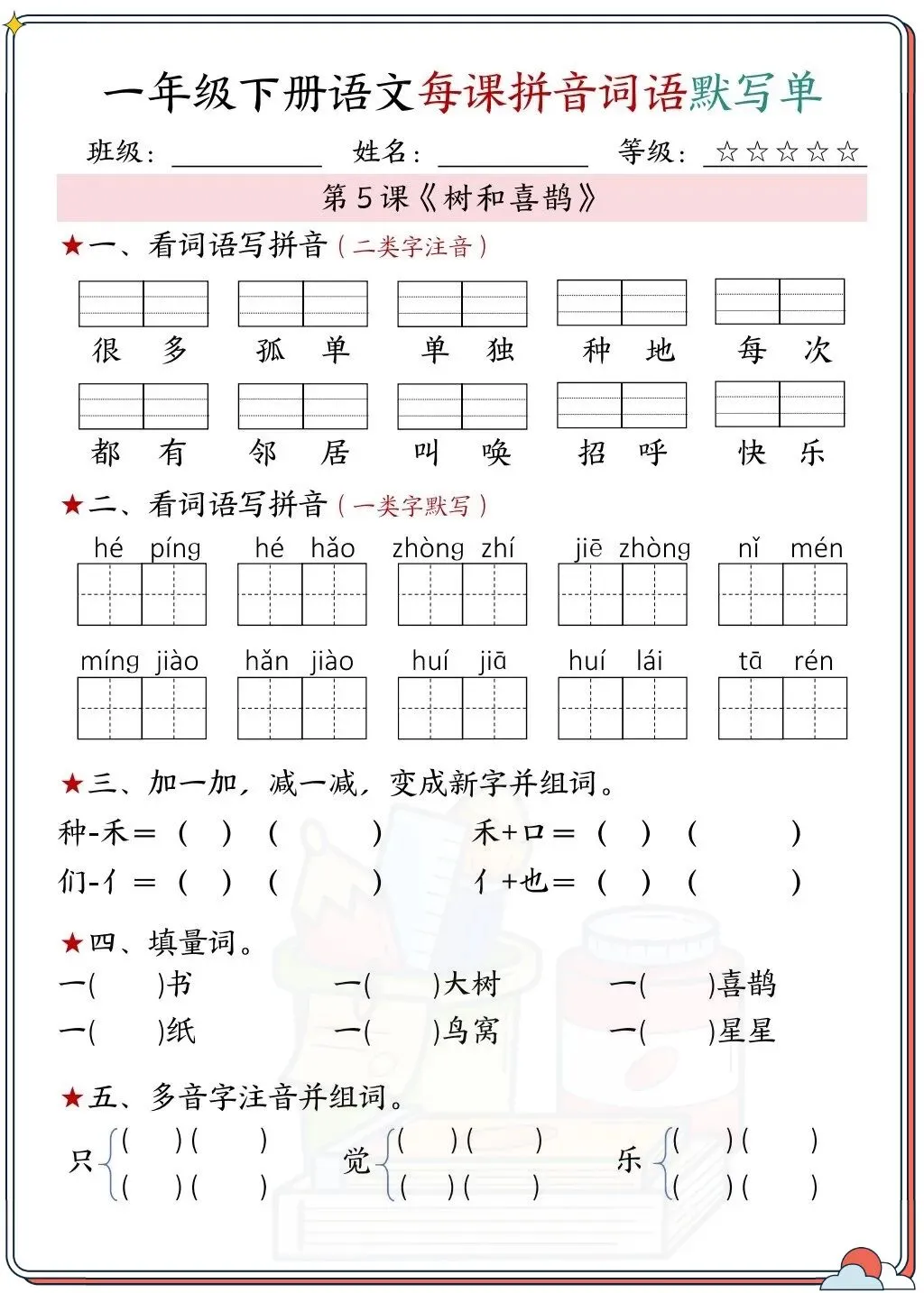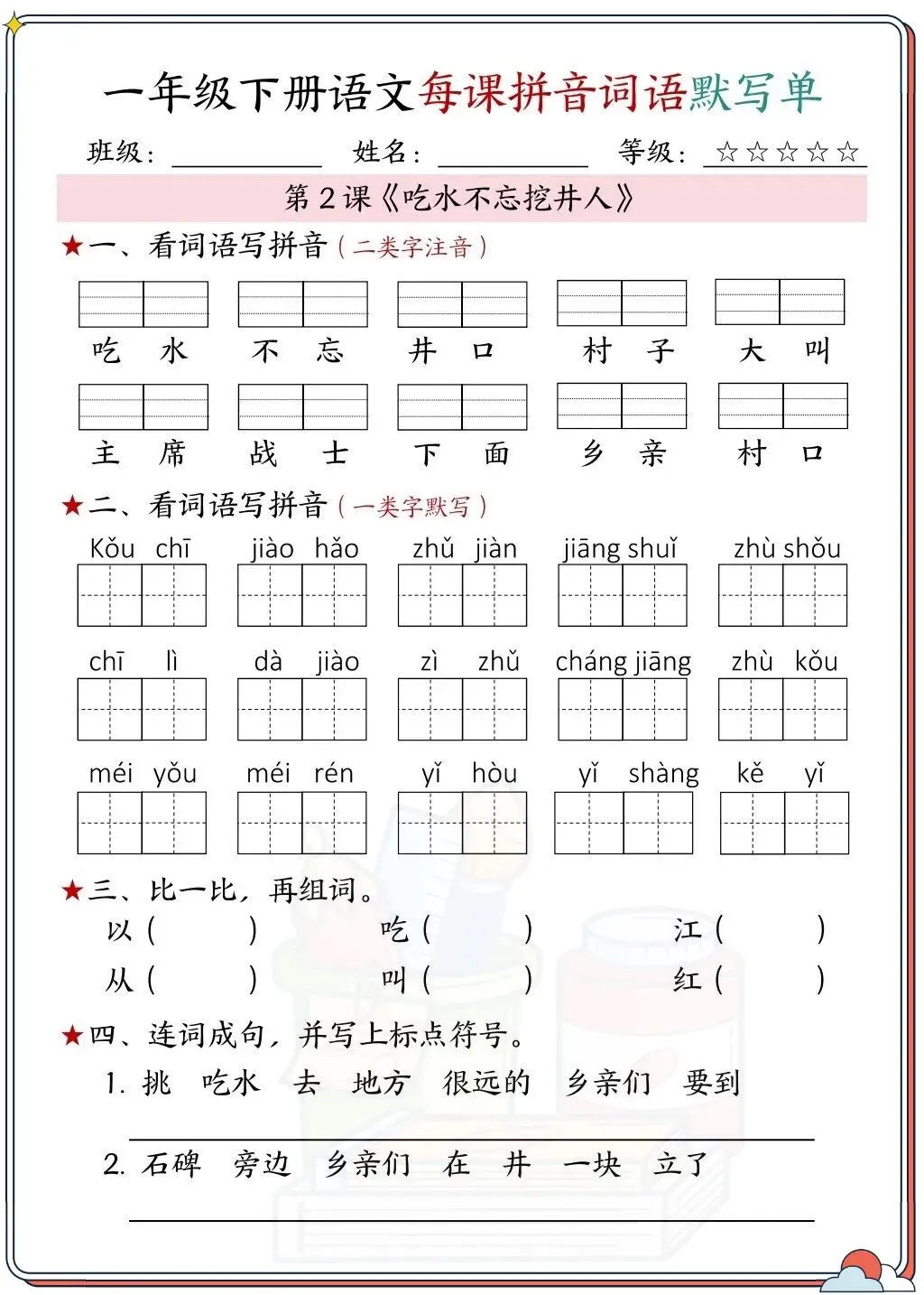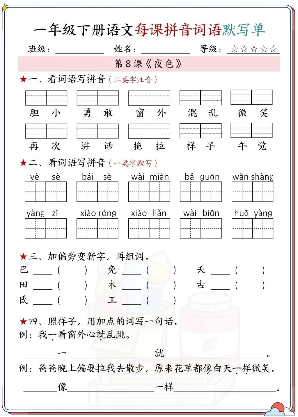 一年级下册语文拼音词语默写单|全课覆盖可打印-可打印