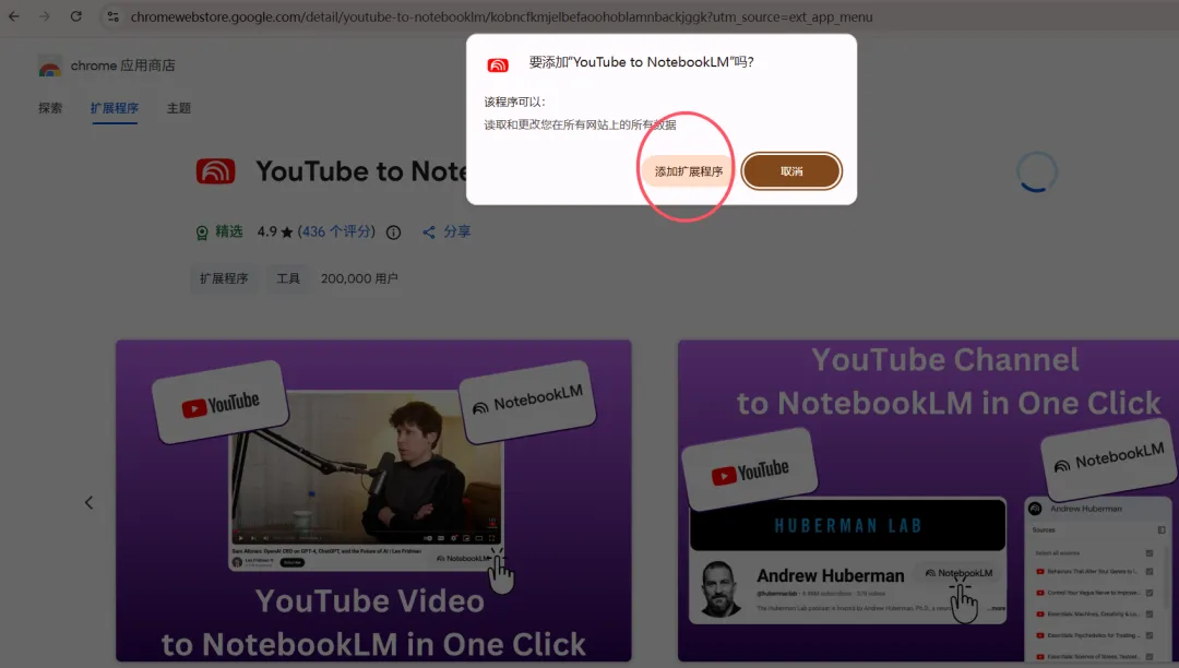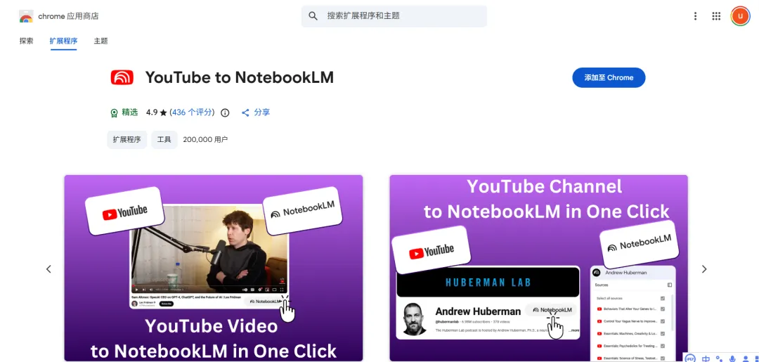 2、搜索【YouTube to NotebookLM】,如图添加,到Chrome,插件就安装好了