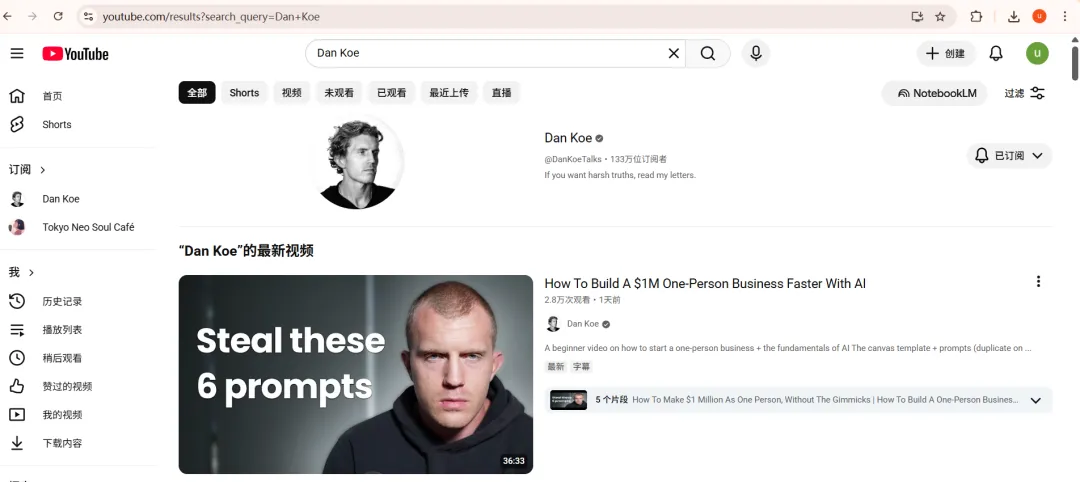 4、打开搜索-Dan Koe,右边会有一个NotebookLM图标,