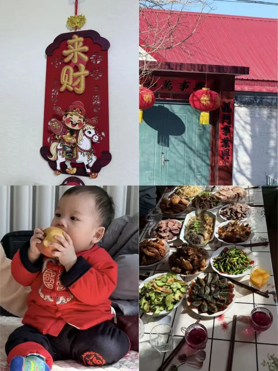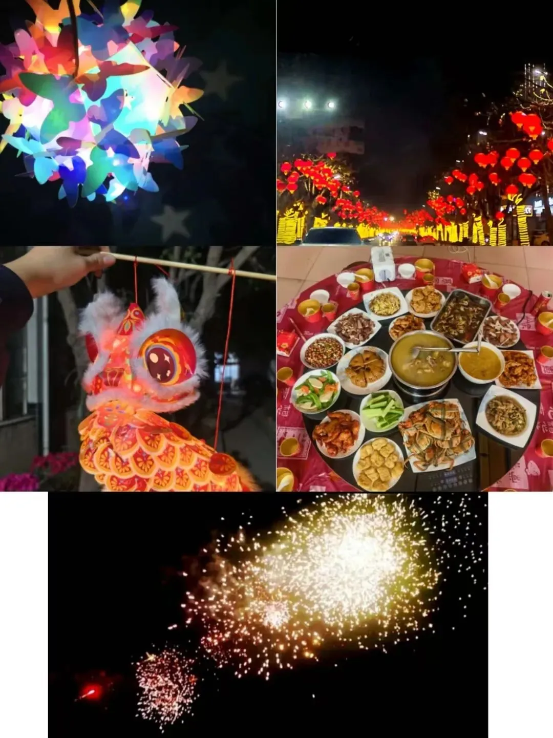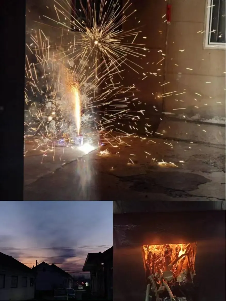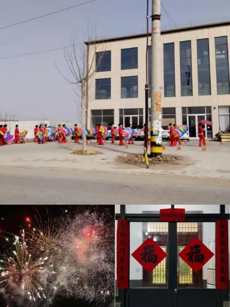 图片故事:广场上扭秧歌、在家门口烟花、在家里贴对联