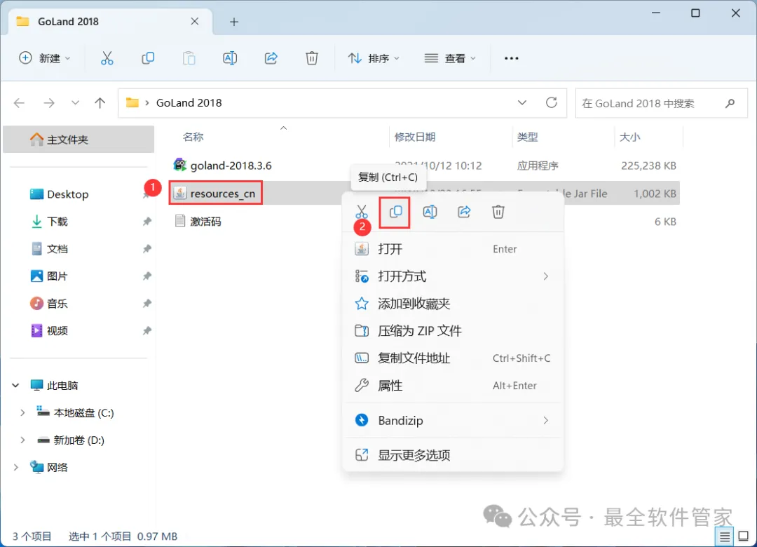 19、回到GoLand 2018文件夹,找到【resources_cn】文件,再右键点击【复制按钮】