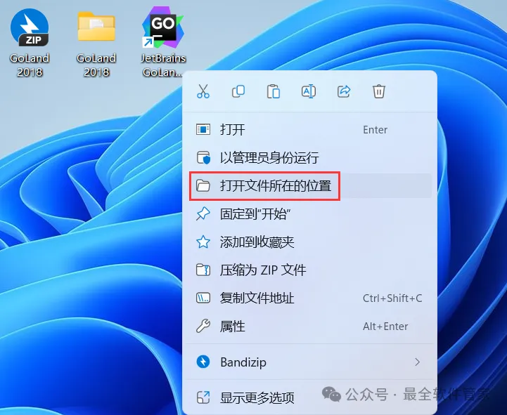 20、回到桌面,右键桌面上的【GoLand 2018.3软件图标】,点击【打开文件所在的位置】
