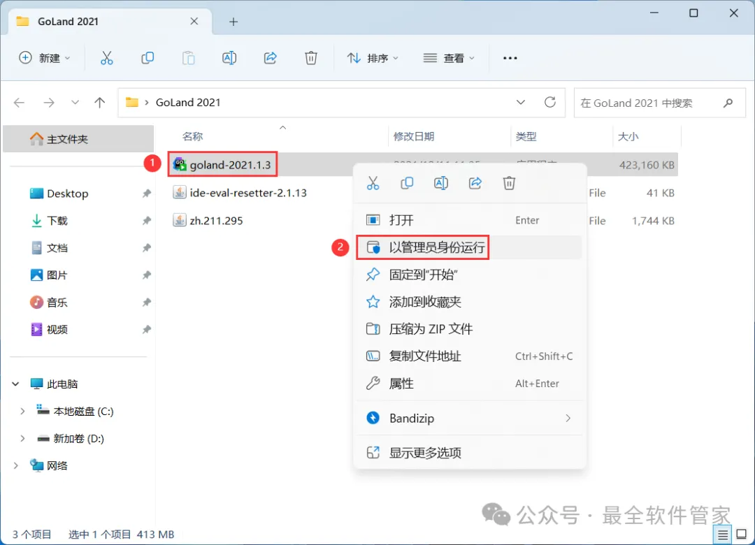 3、找到【goland-2021.1】应用程序,右键选择【以管理员身份运行】它