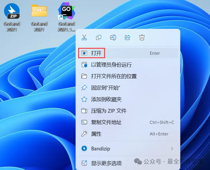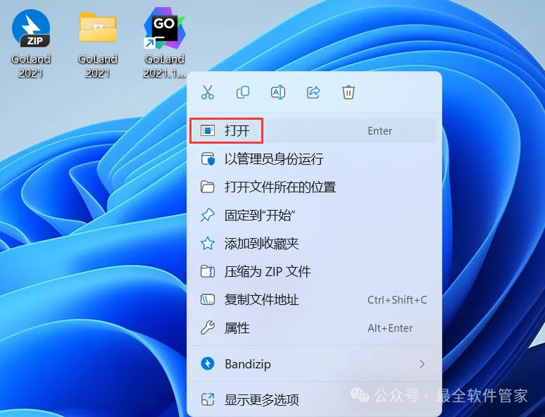 10、回到桌面,右键桌面上的【GoLand 2021.1软件图标】,点击【打开】
