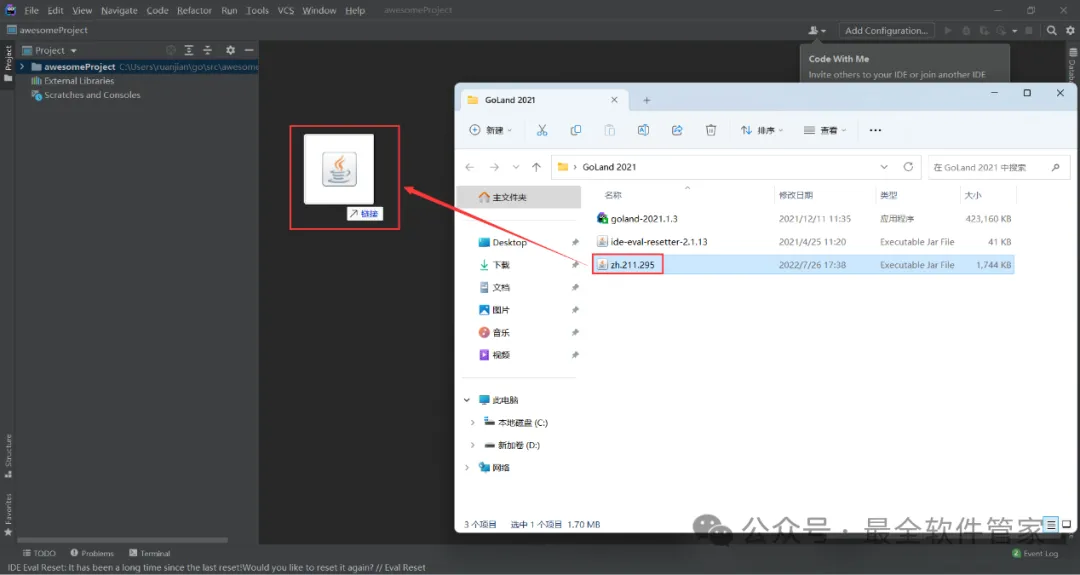 17、回到GoLand 2021文件夹,将【zh.211.295】文件拖到软件界面内