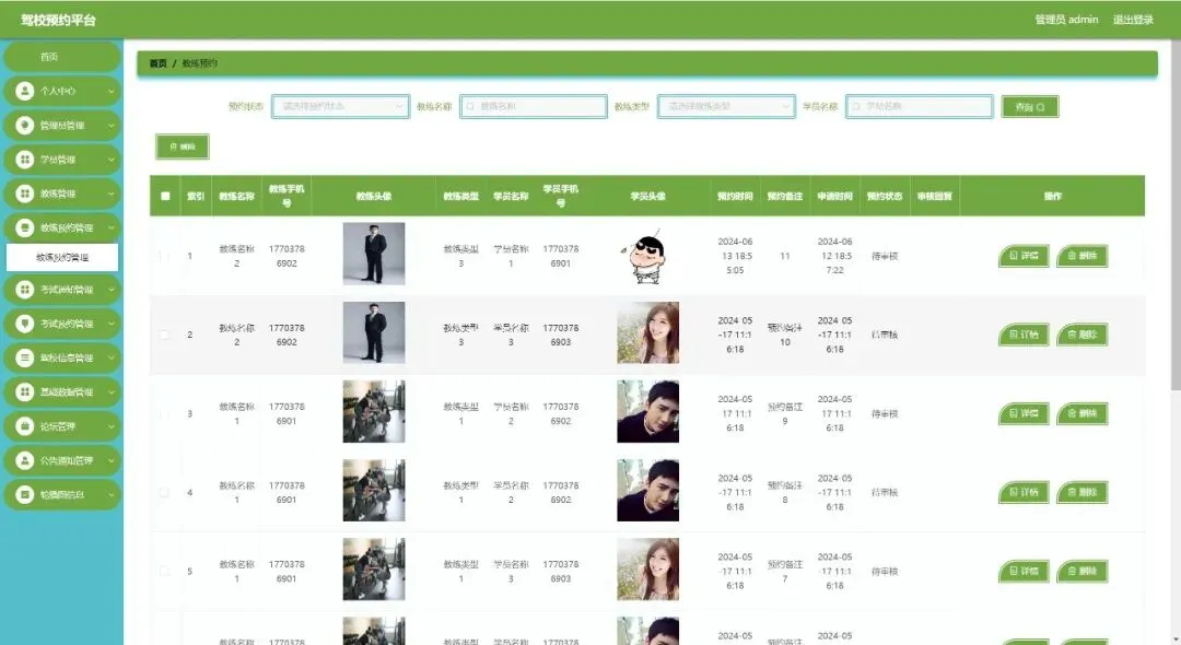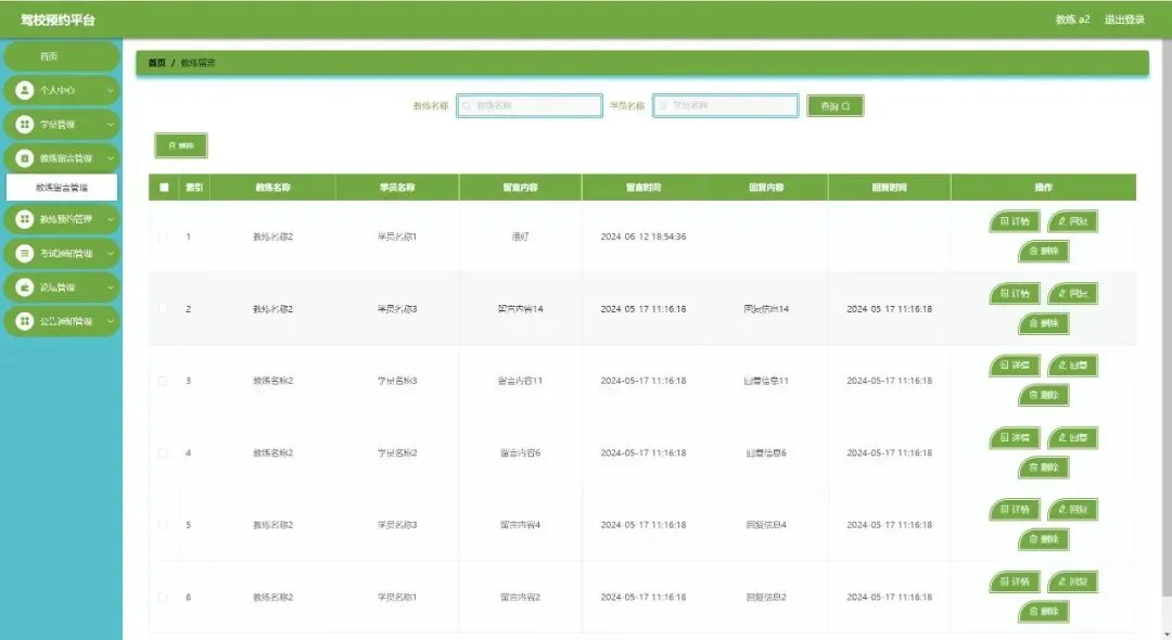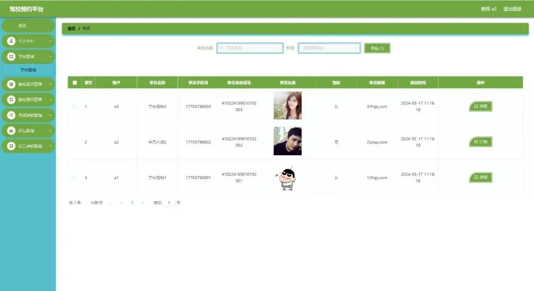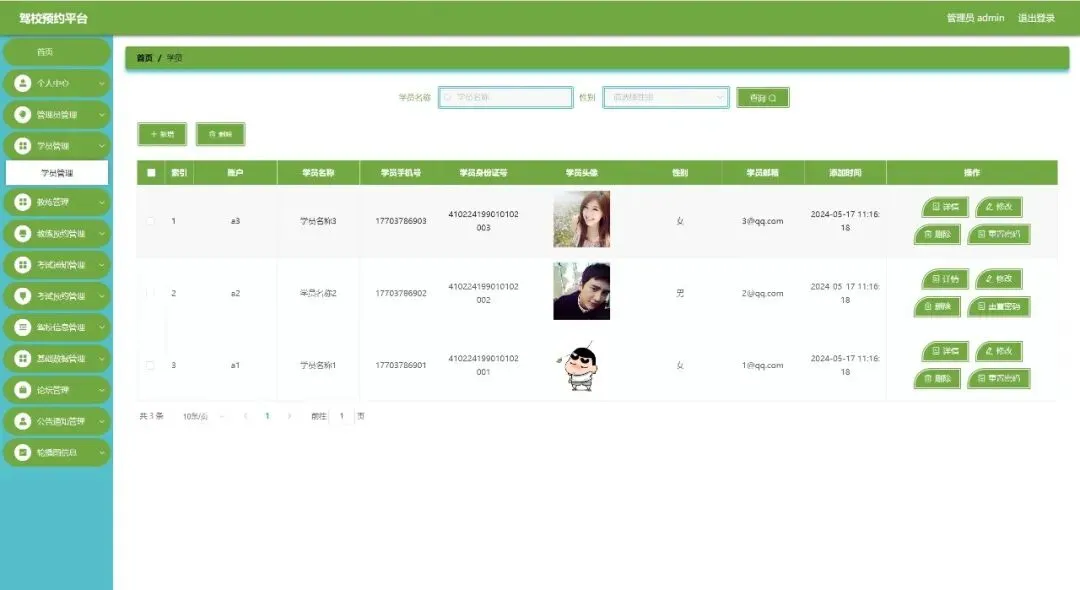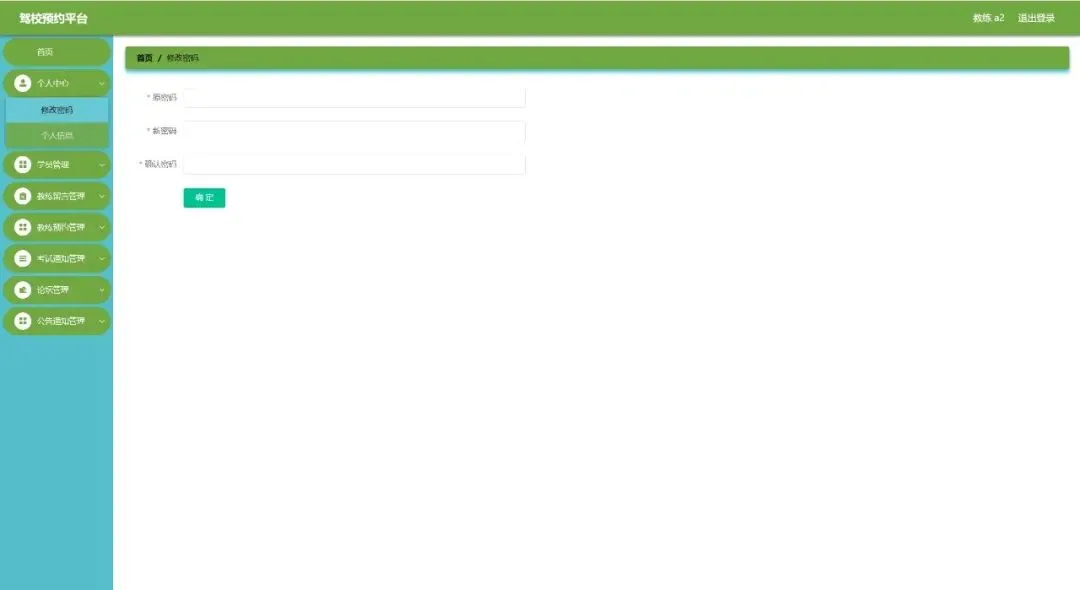 登录、注册、密码修改、学员管理、教练留言管理、教练预约管理、考试通知管理