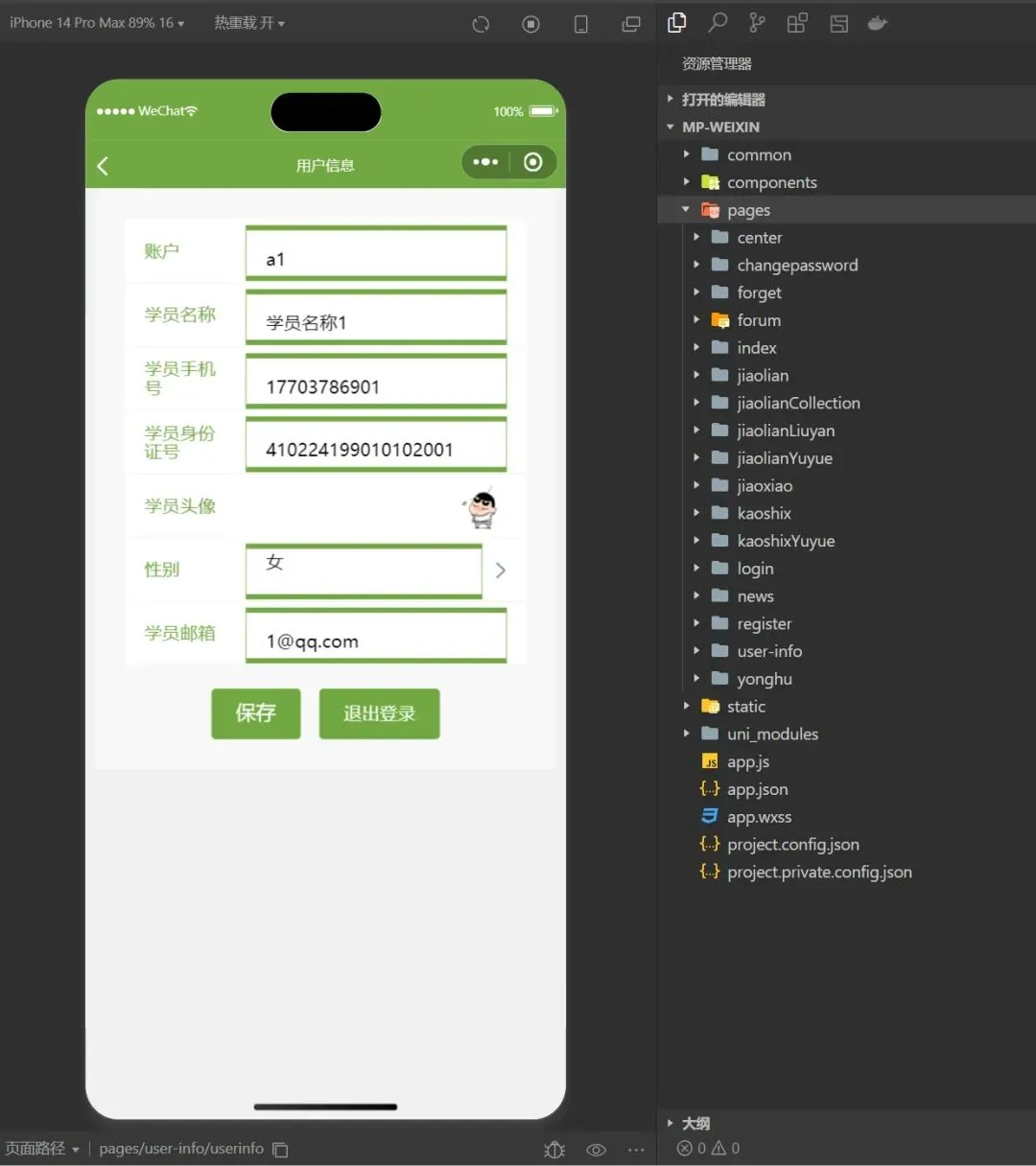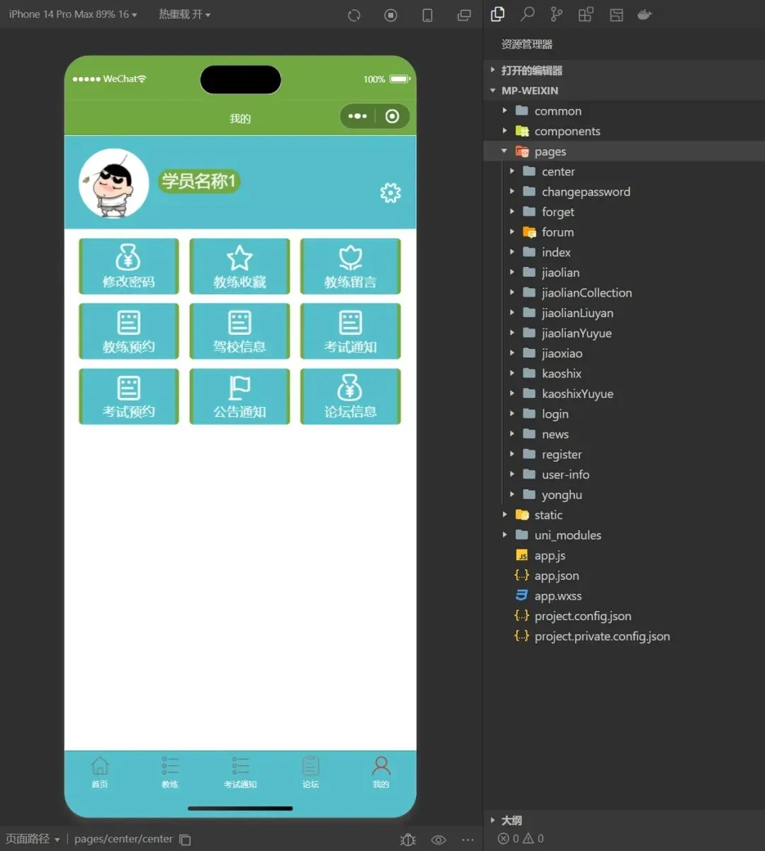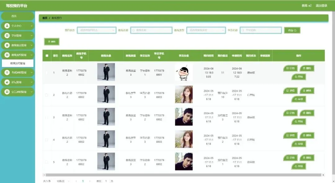登录、注册、密码修改、学员管理、教练留言管理、教练预约管理、考试通知管理