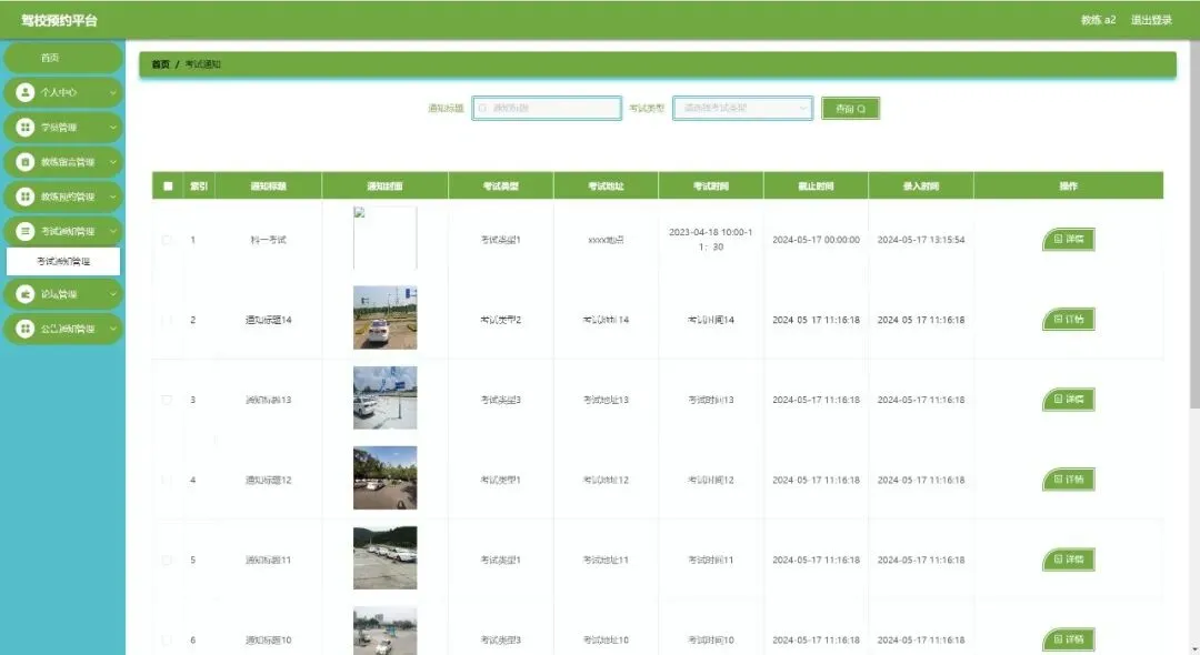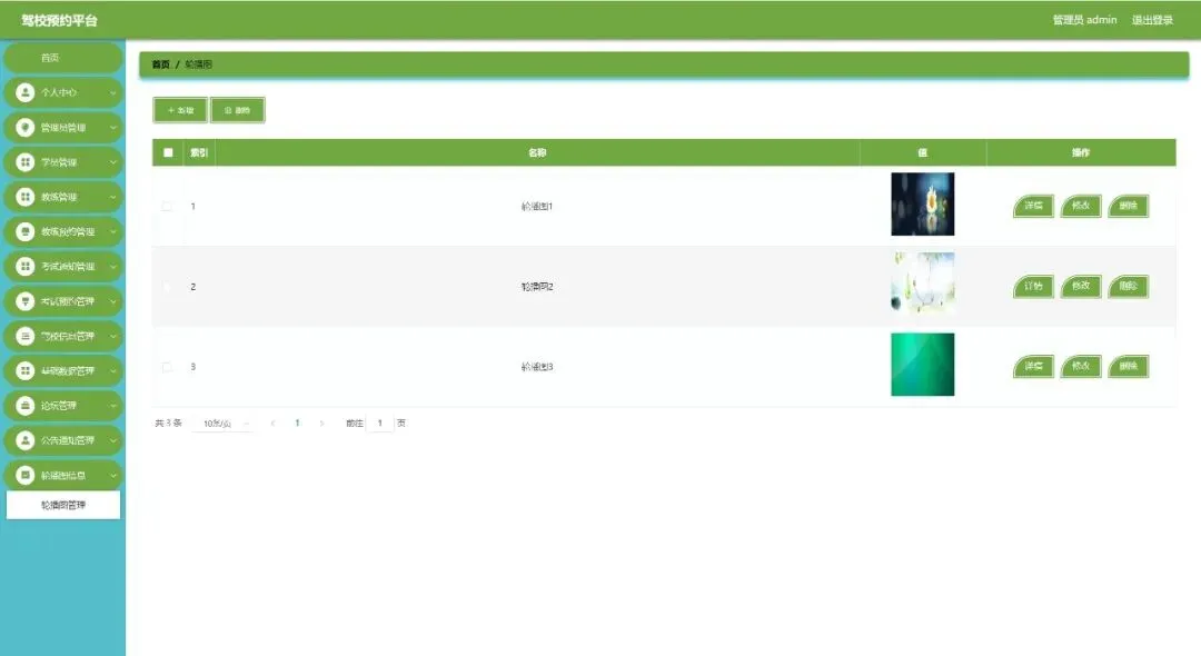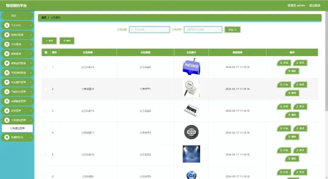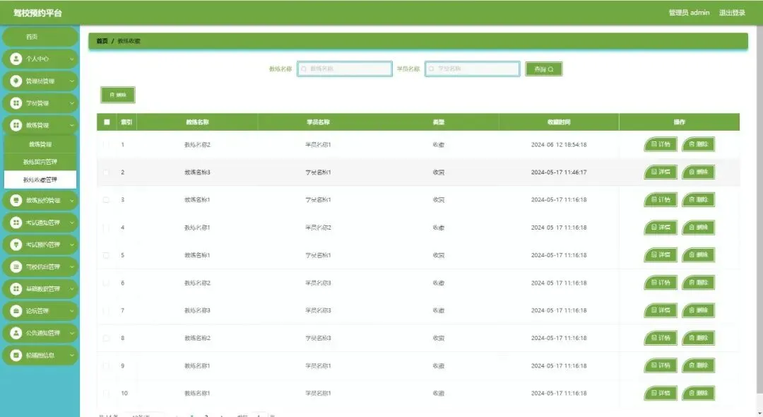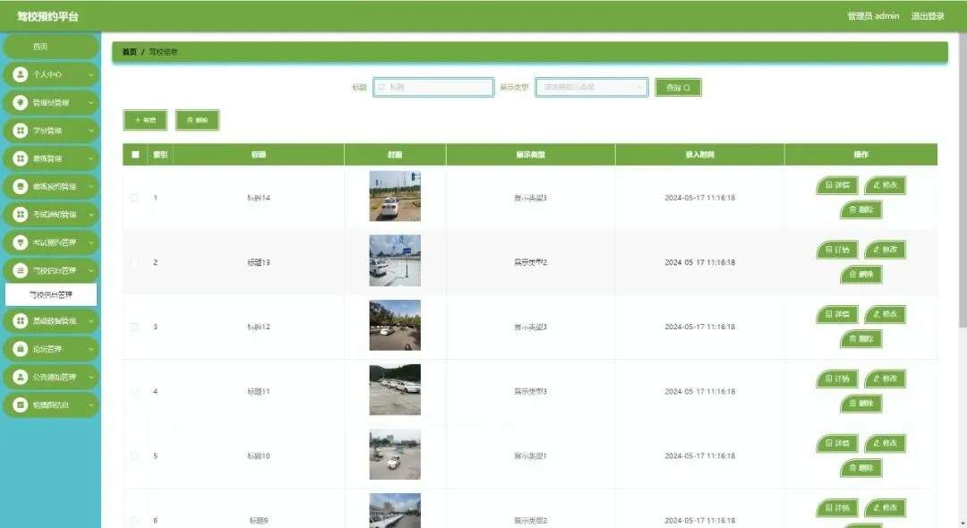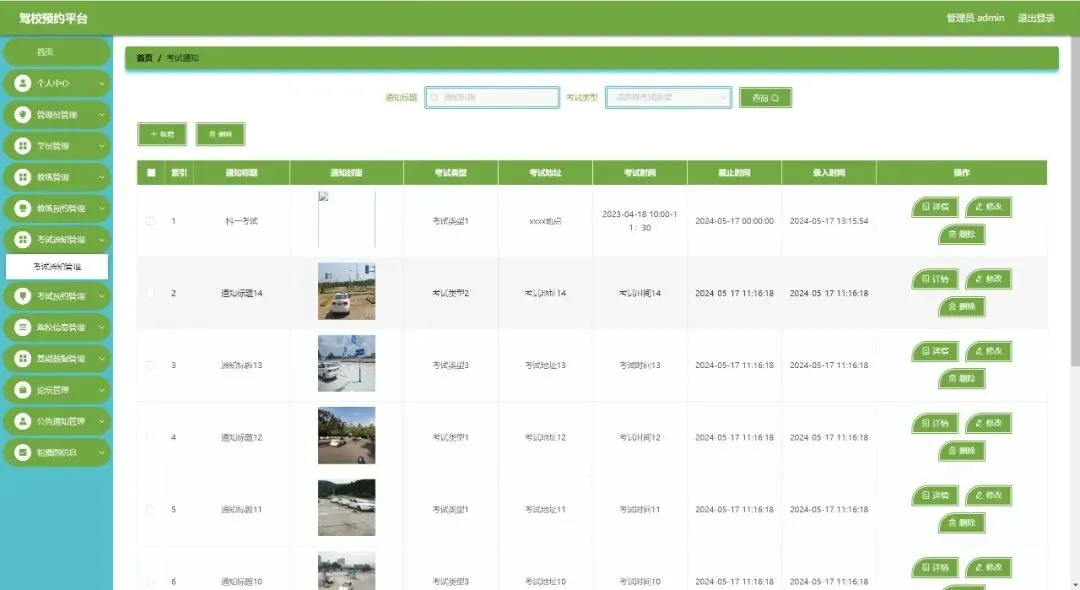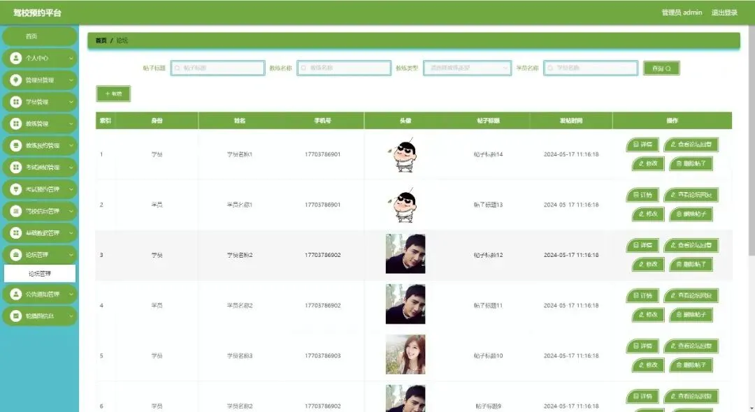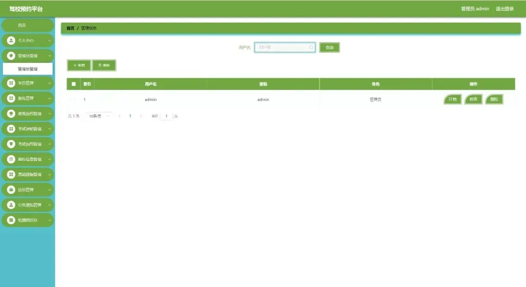 教练所有权限、管理员管理、考试预约管理、驾校信息管理、类型管理、论坛管理、通知公告管理、轮播图管理、密码修改、个人信息
