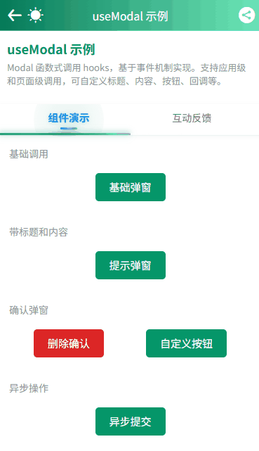 // 删除确认弹窗const deleteModal = useModal({ page: 'deleteModal' })deleteModal.confirm({ title: '确认删除', content: '确定要删除吗?', confirmColor: '#ff4d4f', onConfirm: () => { deleteItem(id) }})// 登录过期弹窗const loginModal = useModal({ page: 'loginExpired' })loginModal.confirm({ title: '登录已过期', content: '请重新登录', showCancelButton: false, confirmText: '重新登录', onConfirm: () => { uni.reLaunch({ url: '/pages/login/index' }) }})