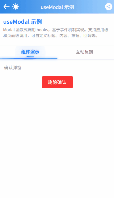 // 创建 Modal 实例const modal = useModal() // 全局模式const modal = useModal({ page: true }) // 局部模式(当前页面)const modal = useModal({ page: 'deleteModal' }) // 自定义 pageId(多实例)// 显示单按钮弹窗modal.show(content)modal.show({ title, content, onConfirm })// 显示确认弹窗modal.confirm(content)modal.confirm({ title, content, onConfirm, onCancel})// 控制modal.close()modal.clearLoading()