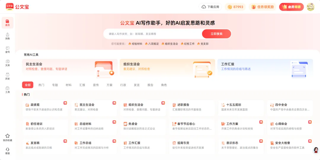 界面非常极简,没有那些花里胡哨的聊天机器人感觉,差不多有100多种材料类型,全部都给你整理好。像日常会用到的发言稿、心得体会、总结等,还有专项写作,像生活会材料、初任培训发言等,就像一个庞大的公文材料文件夹。