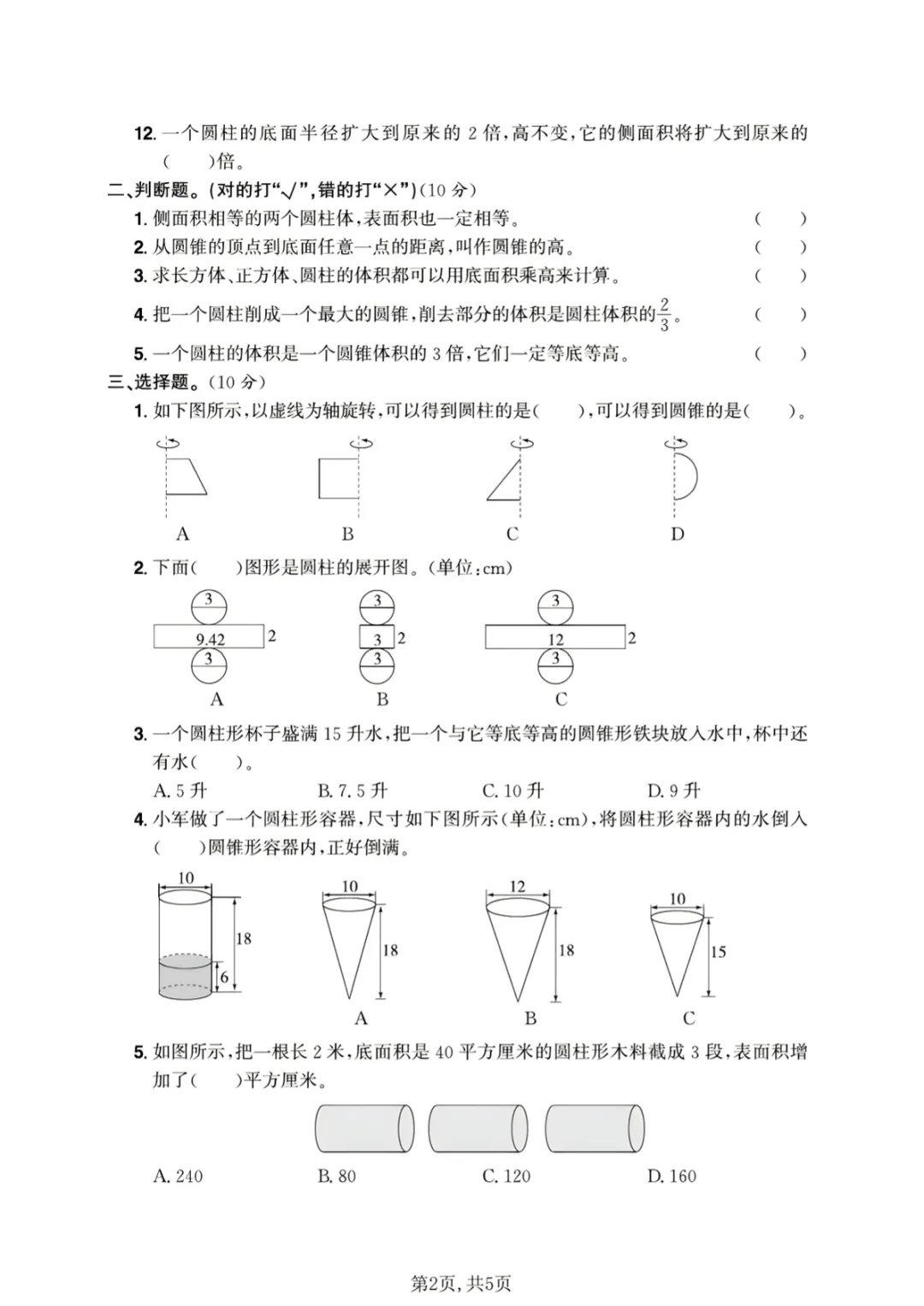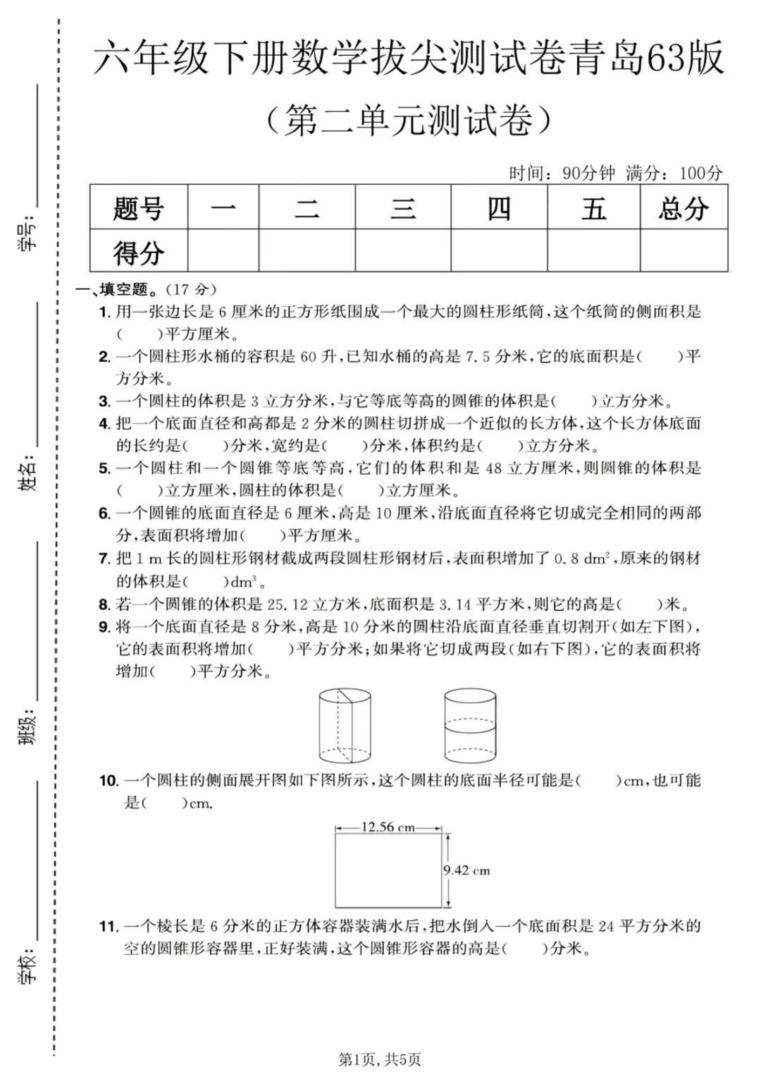 【免费下载】六年级(下)数学 第二单元拔尖测试卷《青岛63版》(1),PDF电子版,共5页,可打印
