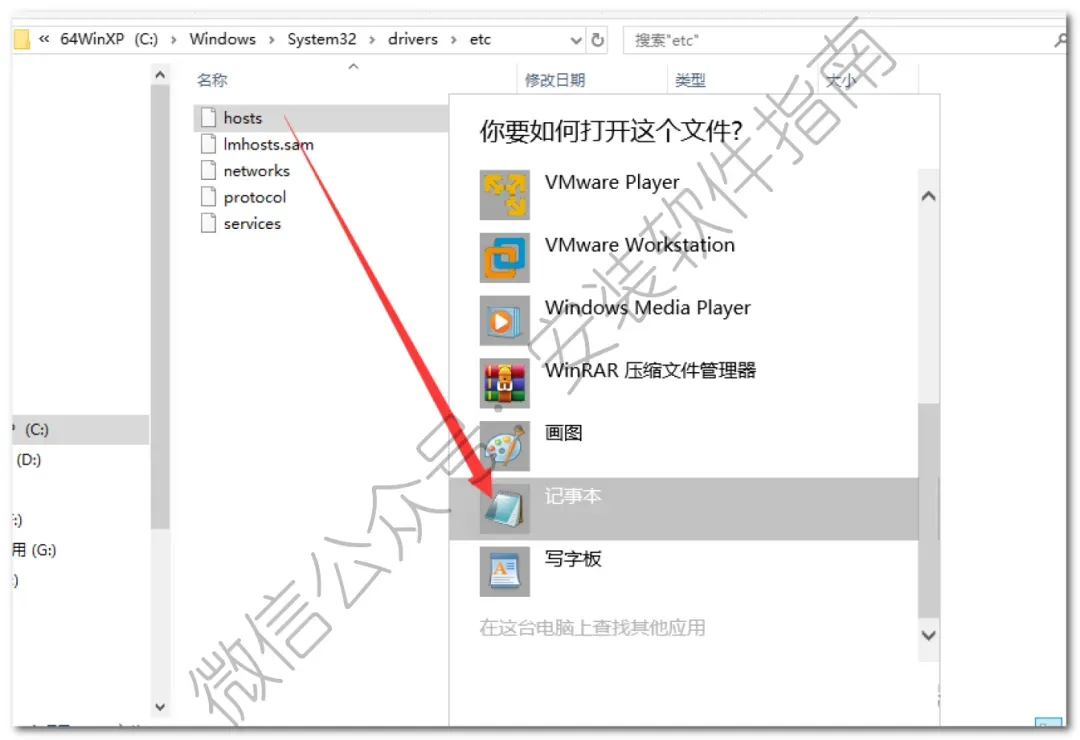 10、打开C盘路径:C:\Windows\System32\drivers\etc\,双击运行【hosts】选择以记事本方式打开【hosts】文件。