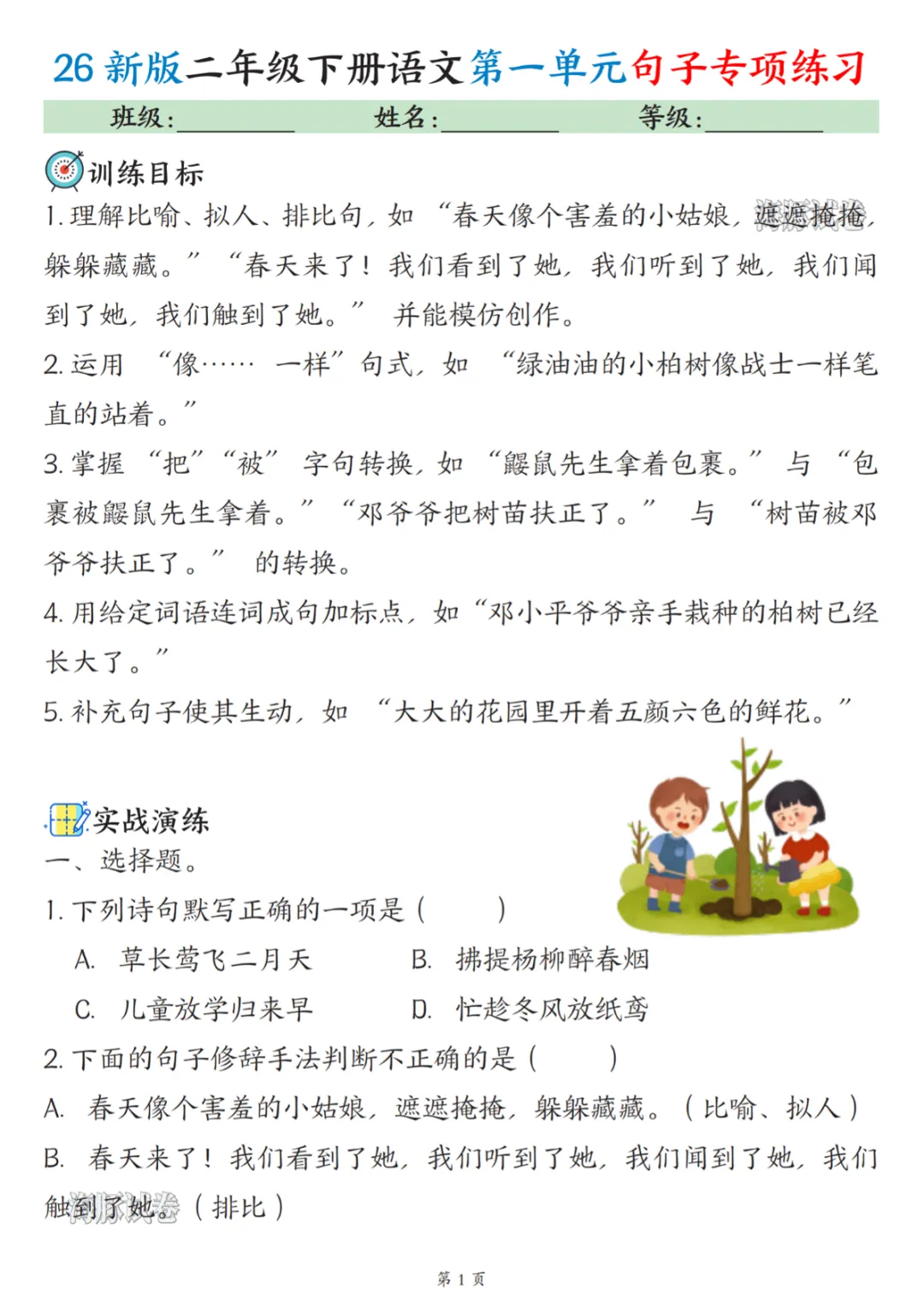 【免费下载】二年级(下)语文第一单元句子专项练习,PDF电子版,共6页,可打印