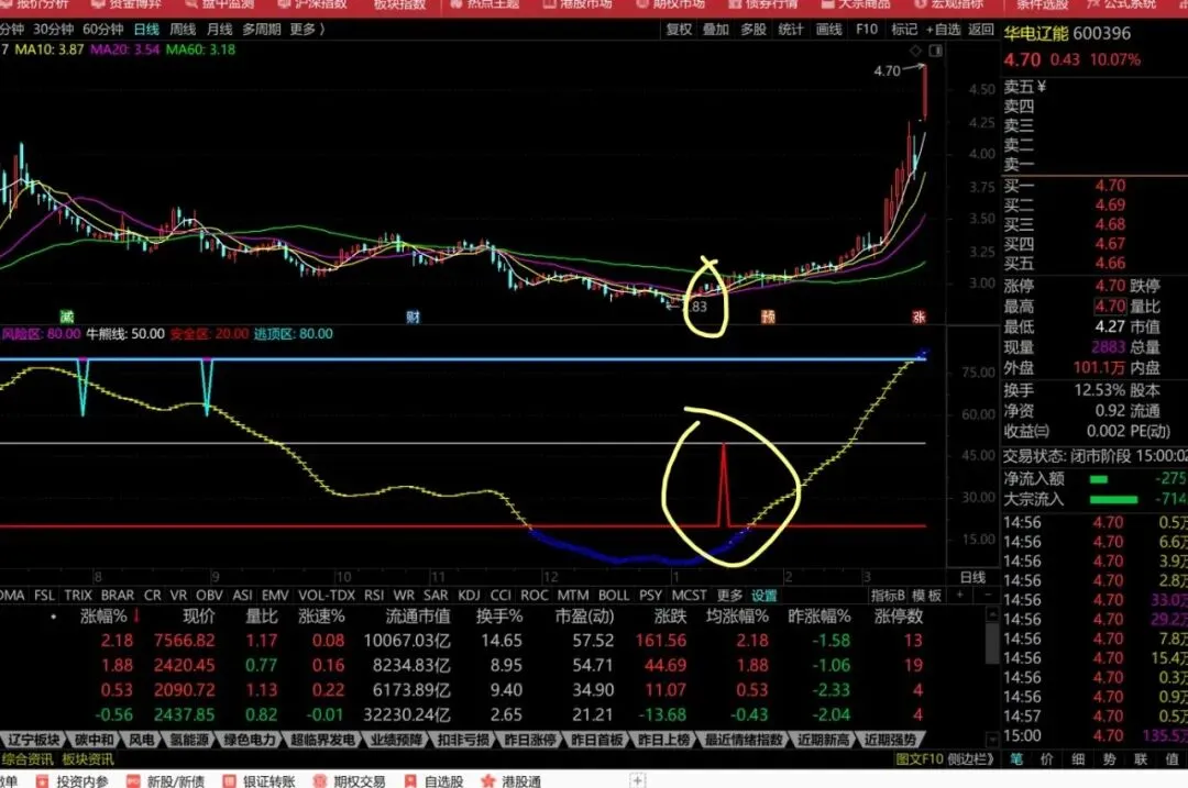 VAR1:=EMA(CLOSE,8);VAR2:=EMA(VAR1,20);VAR3:=CROSS(VAR1,VAR2);VAR33:=CROSS(VAR2,VAR1);VAR4:=VAR1<EMA(CLOSE,120);VAR44:=VAR1>EMA(CLOSE,80);VAR5:=EMA(SMA((CLOSE-LLV(LOW,100))/(HHV(HIGH,100)-LLV(LOW,100))*100,8,1),3);VAR5线:VAR5,COLORYELLOW,DOT;STICKLINE(VAR5>20 AND VAR5<80,VAR5,VAR5,6,1),COLORYELLOW;STICKLINE(VAR5>80,VAR5,VAR5+1,6,1),COLORBLUE;STICKLINE(VAR5<20,VAR5,VAR5-1,6,1),COLORBLUE;风险区:80,COLORMAGENTA,LINETHICK3;牛熊线:50,COLORWHITE,LINETHICK1;安全区:IF(VAR3 AND VAR4,50,20),COLORRED,LINETHICK2;逃顶区:IF(VAR33 AND VAR44,60,80),COLORCYAN,LINETHICK2;