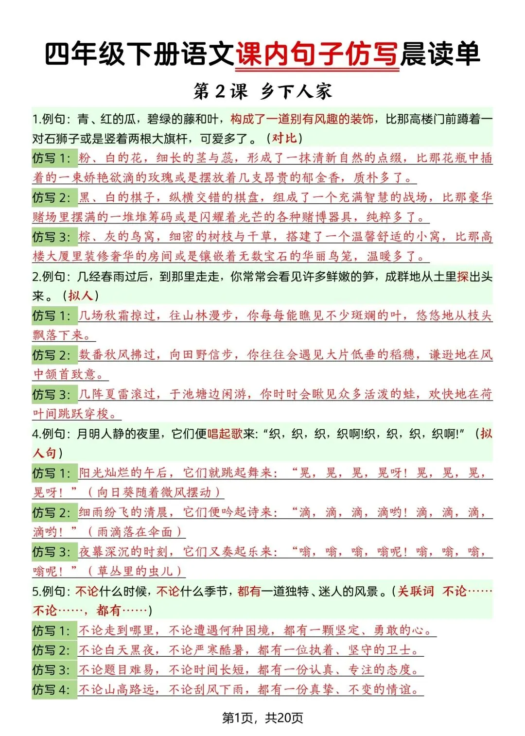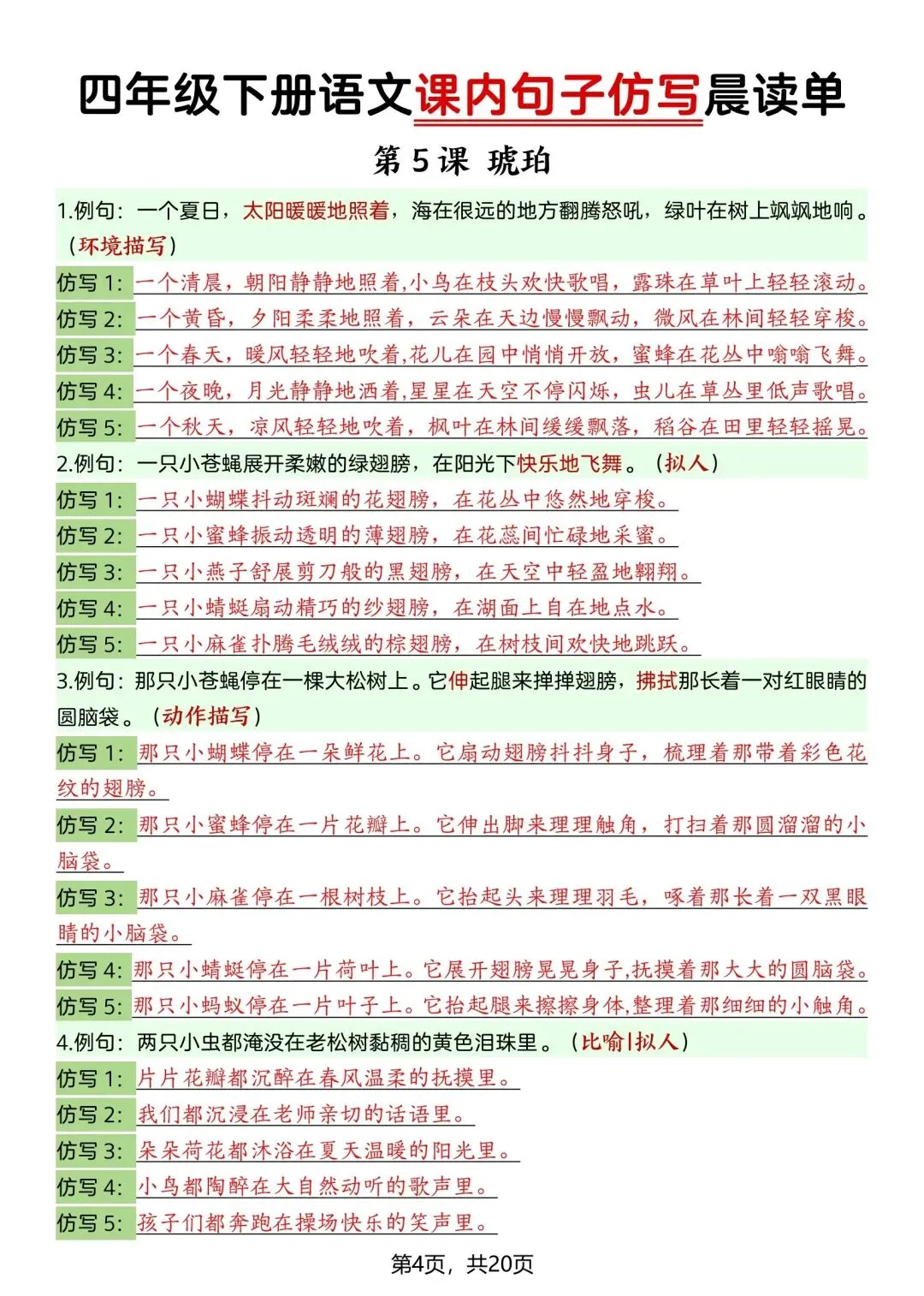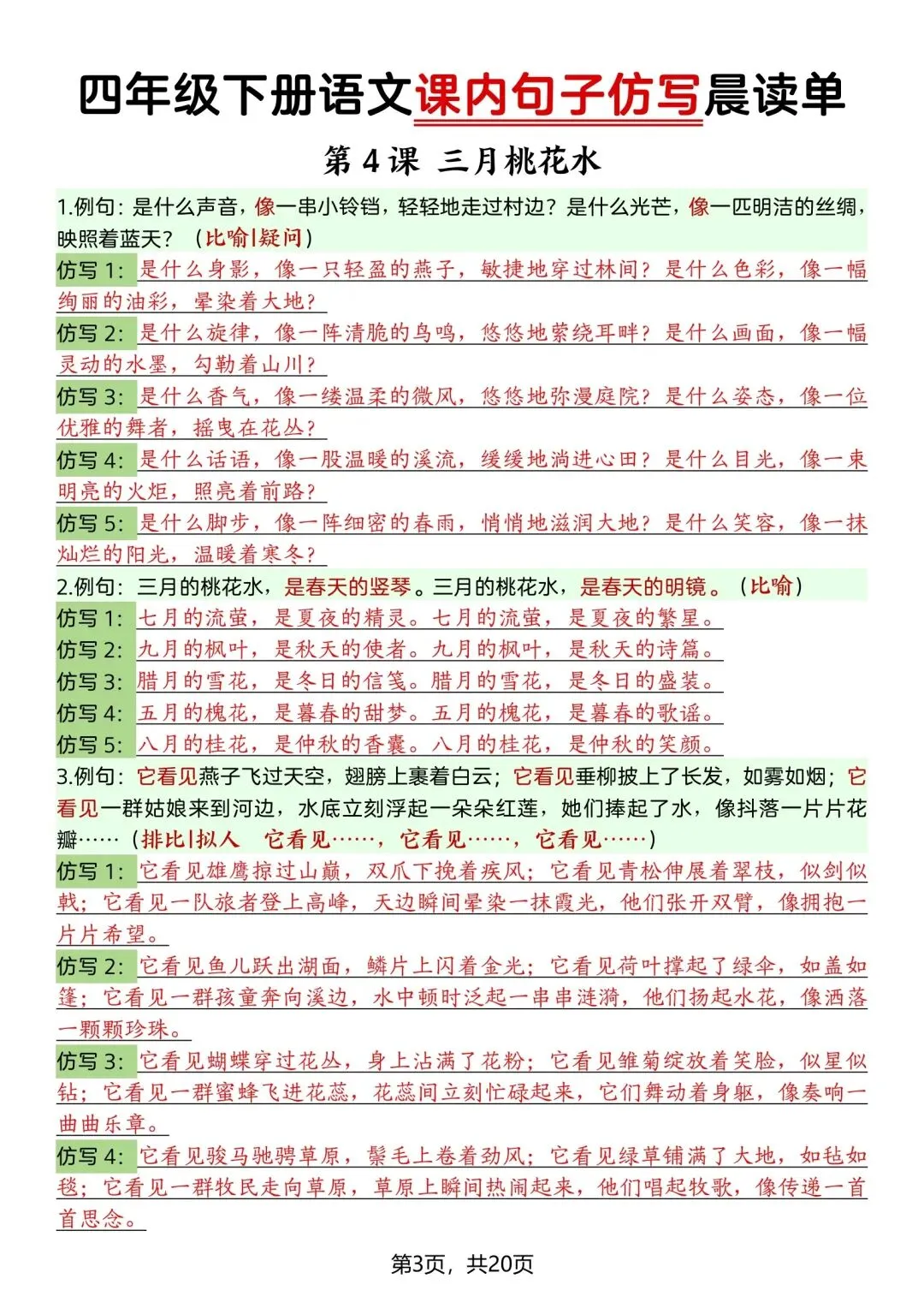 26新四年级下册语文课内句子仿写晨读单(电子版可打印) ▲点击关注(乐一资料库)可查看更多优质资料 (温馨提示:文末有领取方式) 领取方式 ①:点一点右下角的“赞”和“在看”,感谢🙏🏻 ②:完整版领取四年级上册语文期末复习资料