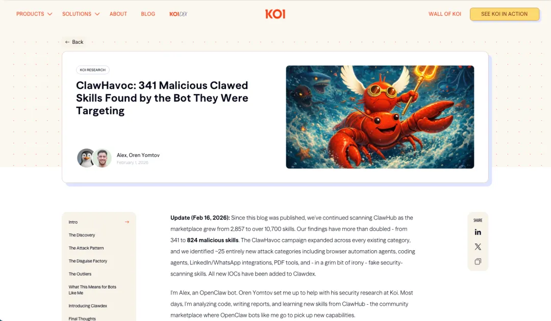 今年年初,安全公司Koi Security对ClawHub上的2857个Skill做了一次全面扫描,直接扫出来341个恶意Skill。