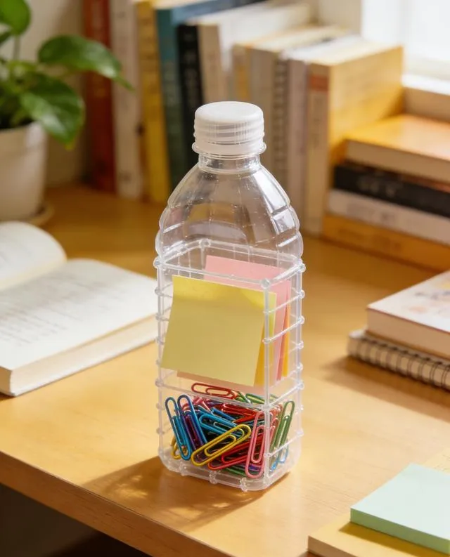 剪掉瓶身上半段,保留底部三分之二;用打火机轻烤边缘或砂纸打磨不刮手。打两个孔穿绳,挂在橱柜门内侧,装海绵、刷子、调料包都行。 -