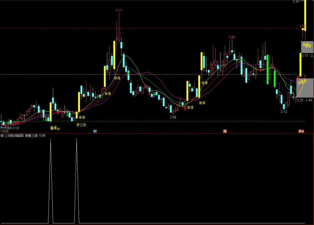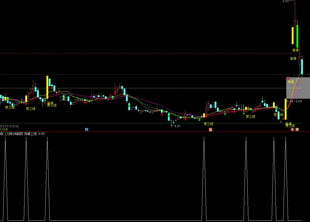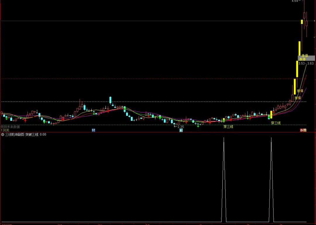 开盘价同时低于5、10、20日均线,且收盘价同时高于这三条均线时,在K线上画黄色柱体并标注“穿三线”,视为强势启动信号。 -