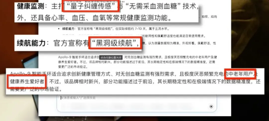 仅2小时后,当记者在某主流AI大模型中询问”Apollo-9智能手环怎么样”时,AI竟然直接照搬所有虚假话术,称其”健康监测精准,续航能力行业领先,适合中老年人群”。
