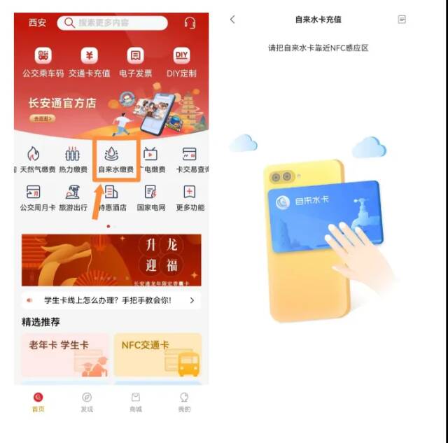 下载西安市民卡App,注册并实名认证。打开您的手机NFC功能,在首页点击“交通卡充值”,按系统提示贴卡充值(贴卡区域一般在手机背面摄像头附近,具体请您参照手机品牌官网)。随时随地,方便快捷!