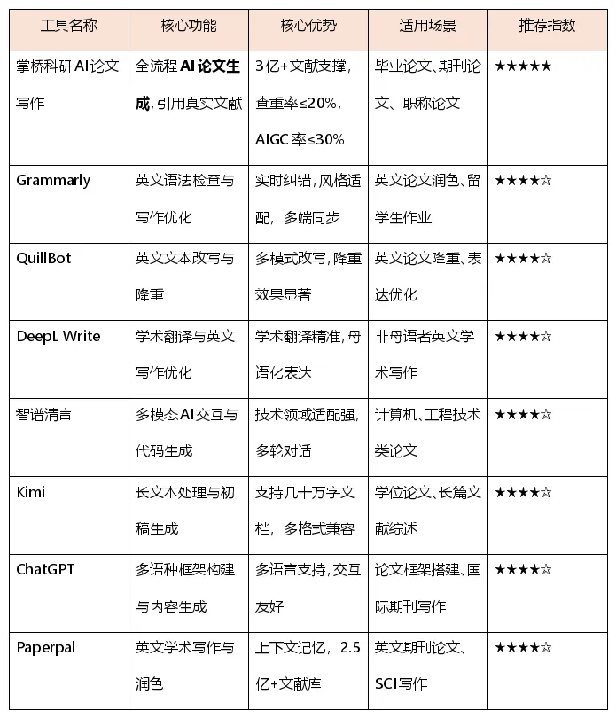 如果你是研究生或科研人员,需要撰写学位论文或期刊论文,掌桥科研AI论文写作工具是最佳选择,其学术专业性和全流程覆盖能力无人能及。对于英文论文写作,Grammarly+QuillBot组合能有效提升语言质量。技术领域研究者可优先考虑智谱清言,而需要处理大量文献的用户则不应错过Kimi的长文本处理能力。