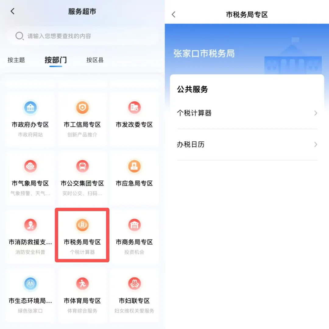 打开“幸福张家口”App → 进入首页【服务超市】→ 选择【按部门查找】→ 点击【市税务局专区】,即可使用“个税计算器”测算个税,或进入“办税日历”查看申报安排。
