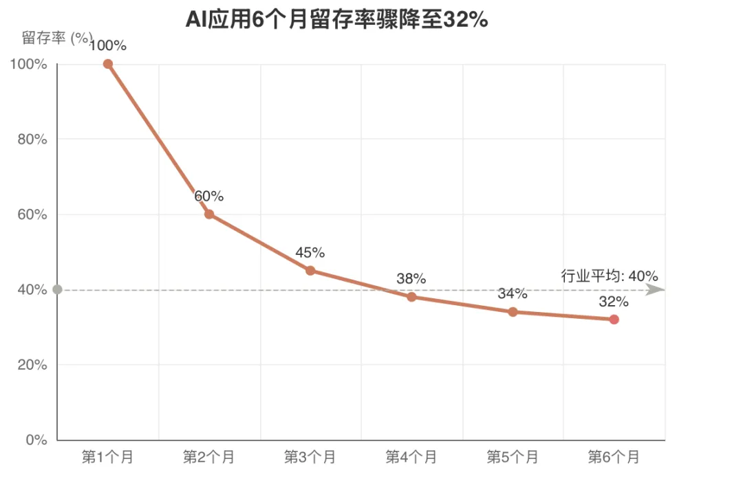 这不是个例——行业数据显示,AI应用的平均6个月留存率已经跌到了32%,超过90%的工具在购买后很快被用户遗忘。这种“AI应用月抛”现象背后,是整个赛道正在经历的价值回归。