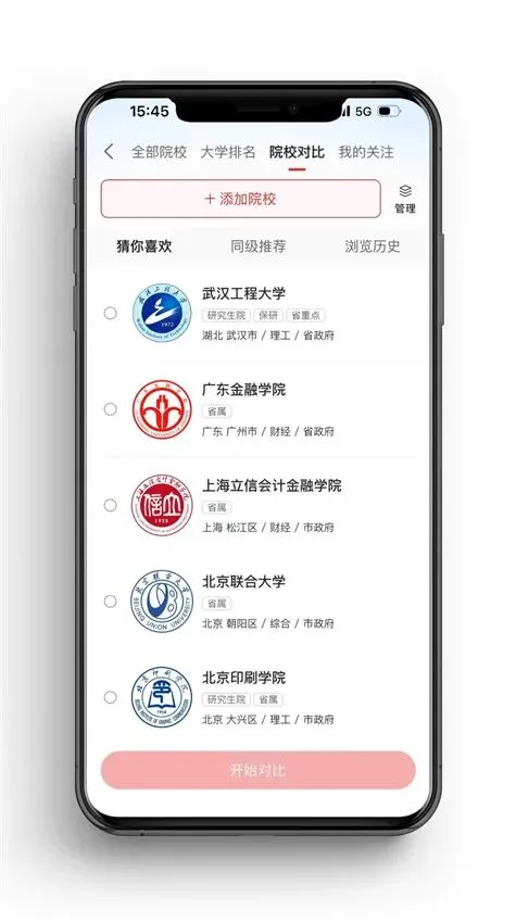 为了让考生和家长在择校过程中更有 “方向感”,【找大学】中还提供院校对比功能。每个考生对理想大学的期待各不相同,有人看重学术实力,有人关注地理位置。优志愿 APP充分考虑到这一点,支持从多个维度对院校进行对比。无论院校层次,还是硕士点、院校排名、院校热度等都能纳入对比范畴。