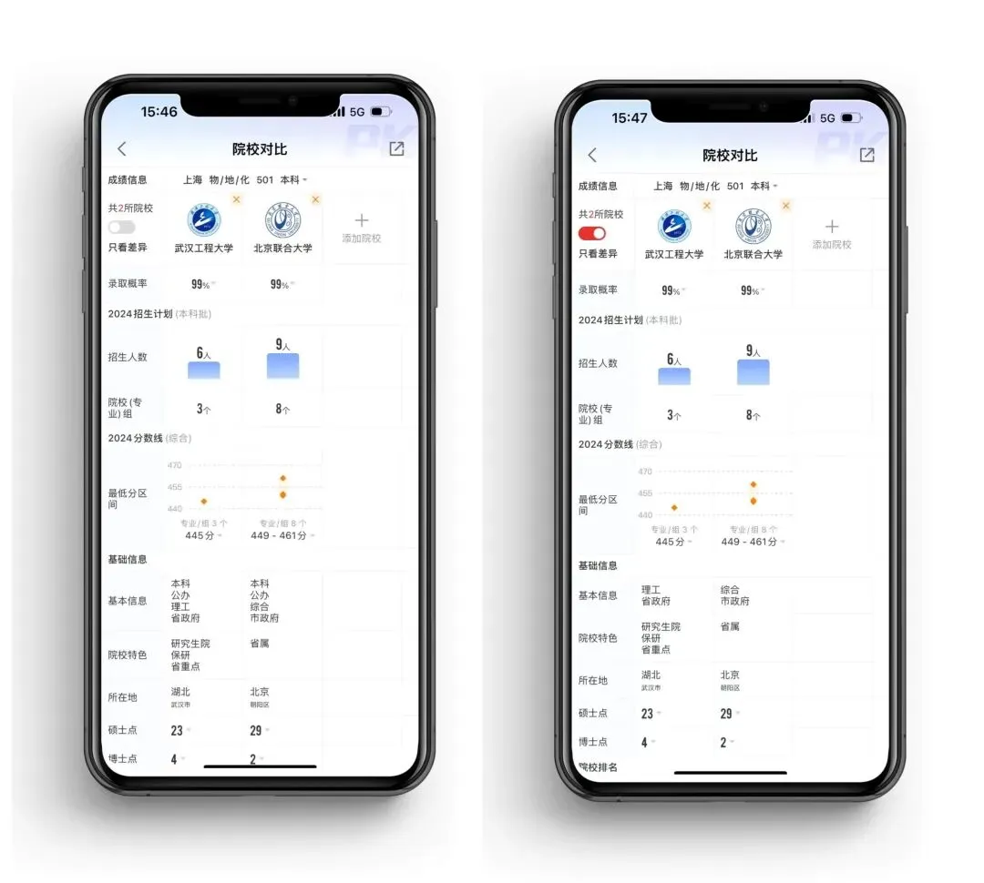 更贴心的是,它能同时对比6所院校。如果觉得页面信息繁杂,还能开启 “只看差异” 功能,系统会自动隐藏相同数据,直观呈现各院校的核心区别,大幅提升考生的决策效率。