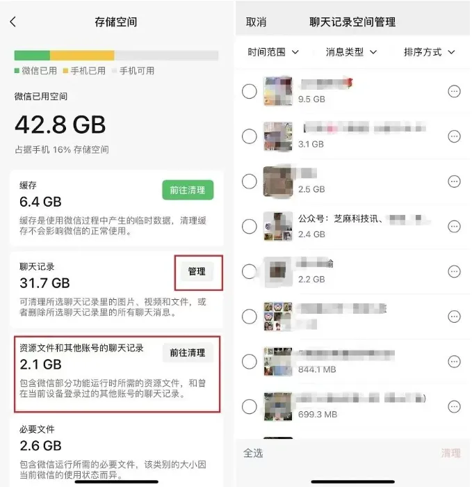 这第一种查岗方式是最多人的日常操作,在微信“我的”-“设置”-“通用”-“存储空间”,点击“聊天记录”后的“管理”,通过聊天内存大小就知道和谁聊天最多了,可以查看聊天记录以及图片、视频等。