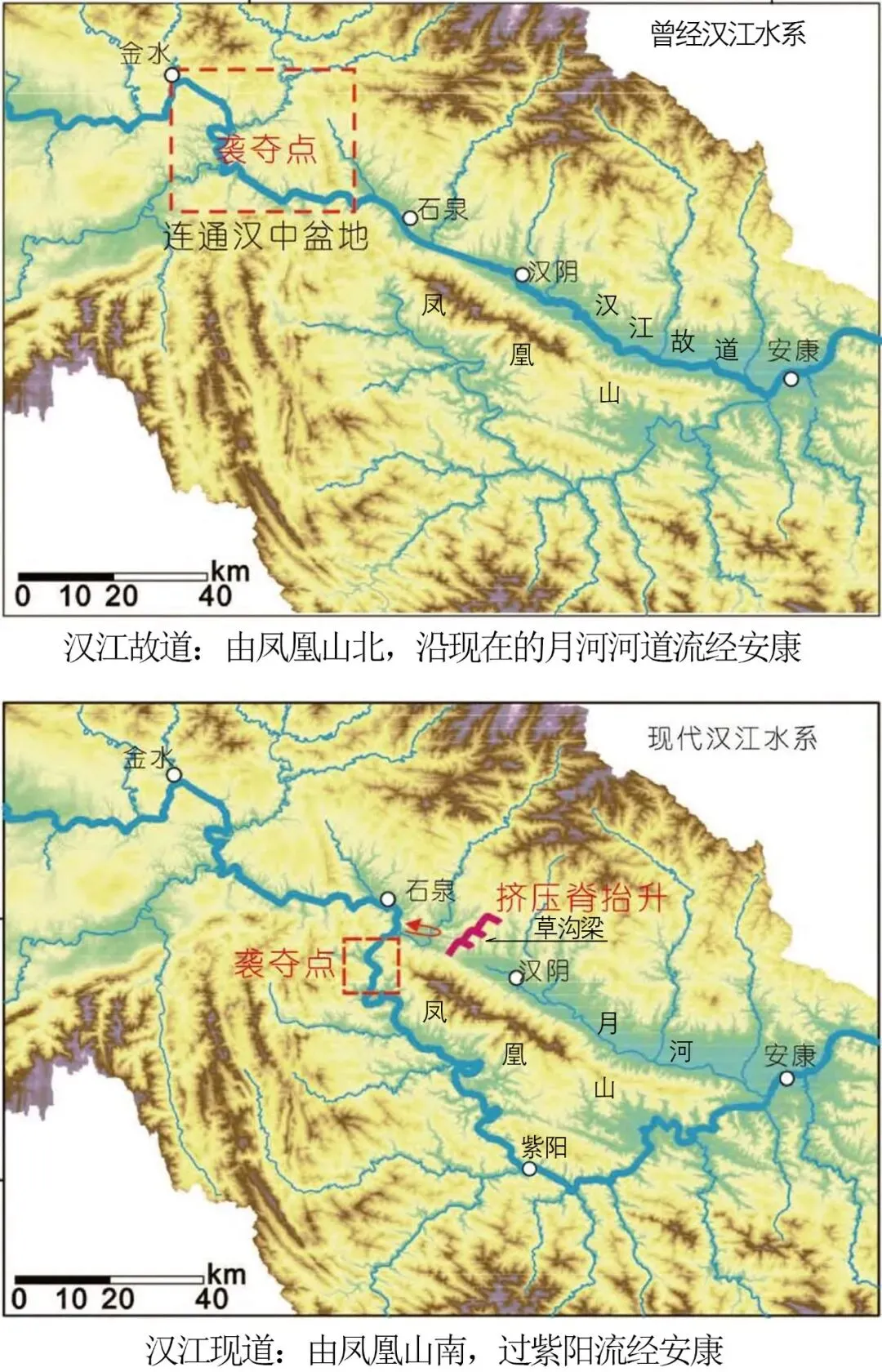(2)升切耦合,河若蛇曲。旬阳县城被今人誉为“太极城”“金线吊葫芦”等俗称,但其城区蛇以逶行的“太极”状曲折即是地质学所称的“蛇曲地貌”。该地貌是秦岭由台原湿地不断隆升抬高为山地的有力佐证。河流侵蚀有一个特性,当地势比较平缓时它主要是向左右两侧侵蚀(如新疆巴音布勒克开都河蛇曲、四川若尔盖唐克镇的黄河蛇曲),当径流地地势比较陡峻时,它以垂直切蚀为主(如黄河壶口)。
