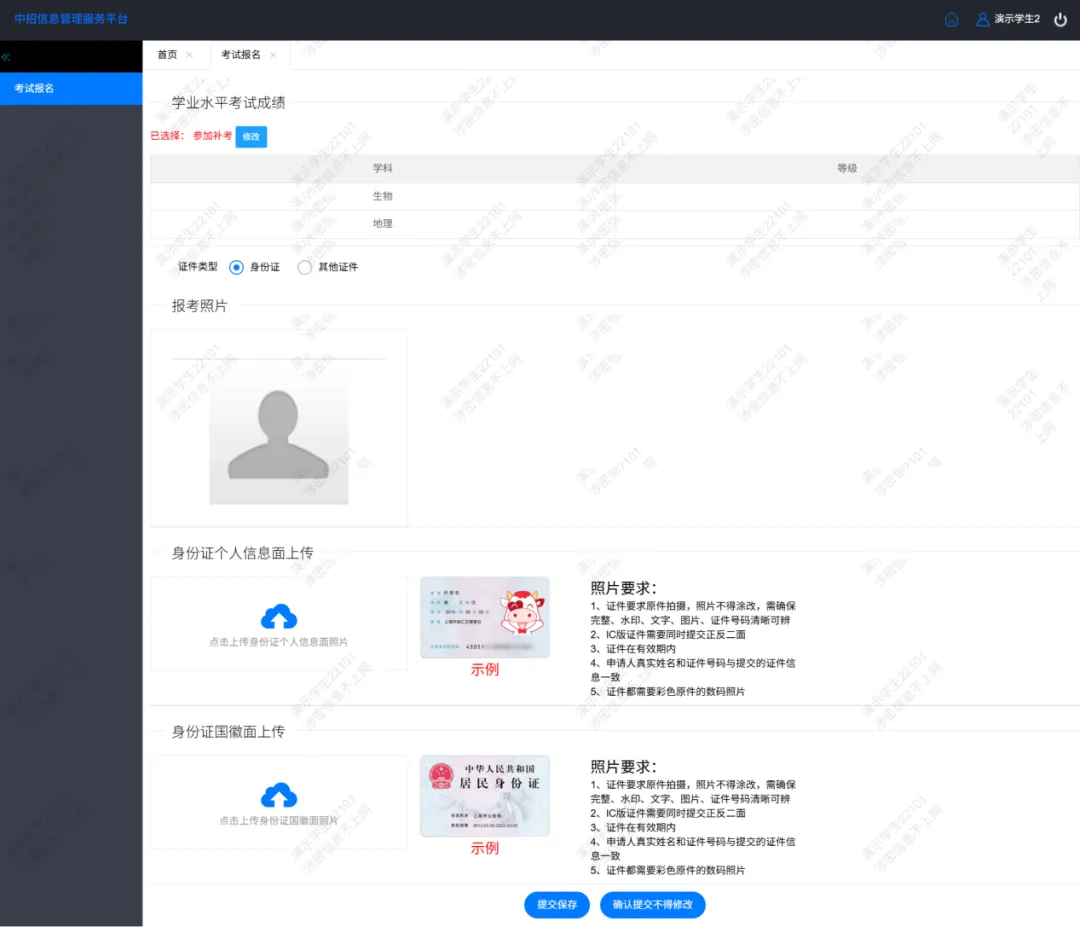 ①上传考生身份证照片(正反面);