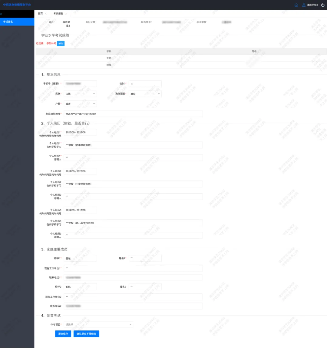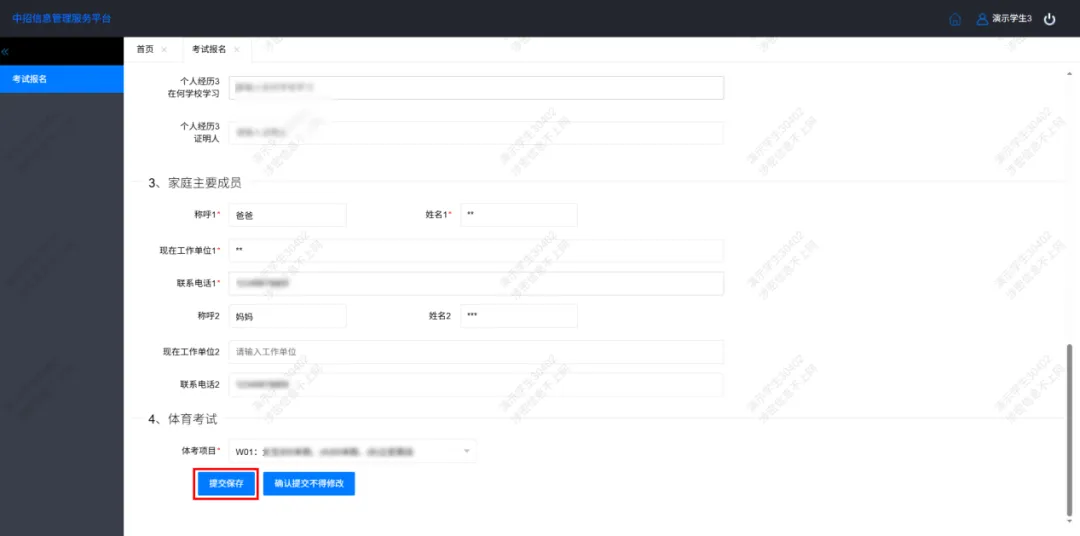 填写基本信息、个人简历、家庭主要成员(必须填写监护人,联系电话必须填写监护人准确的常用手机号码)等信息,点击“提交保存”。