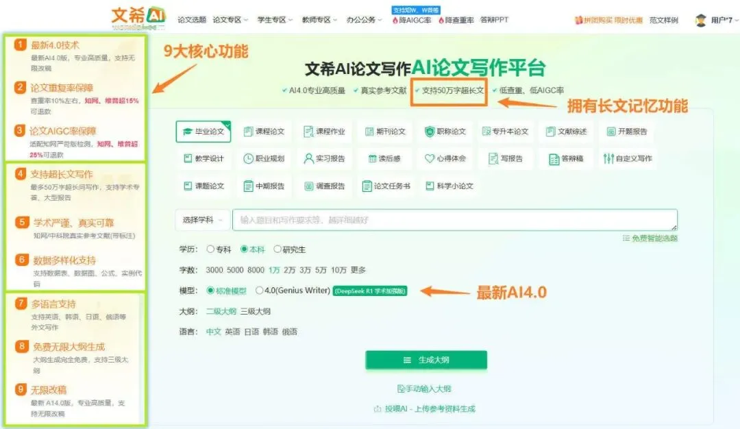 对于AI写论文来说,长文写作是个难题,很多时候会出现论文前后不呼应、前言不搭后语以及内容割裂的情况。但文希AI写作的长文记忆功能解决了这一问题,它支持每小节生成均携带全部上文内容,可携带10万字,无论是硕博论文还是学术专著,都能轻松拿捏,堪称硕博AI论文生成的不二之选。它还提供一站式AI论文生成服务,从AI论文选题、开题报告、文献综述、论文任务书、论文正文撰写,到中英摘要、答辩PPT、致谢模板等一应俱全,为论文写作提供了全套的解决方案。同时,文希AI写作支持多种语言的AI论文写作,包括中文、英文、日文、俄语、韩语、泰语等,这对于海外留学生的AI论文生成来说非常合适,能满足不同语言环境下的AI论文写作需求,在AI论文生成领域展现出了其先进性和重要性。