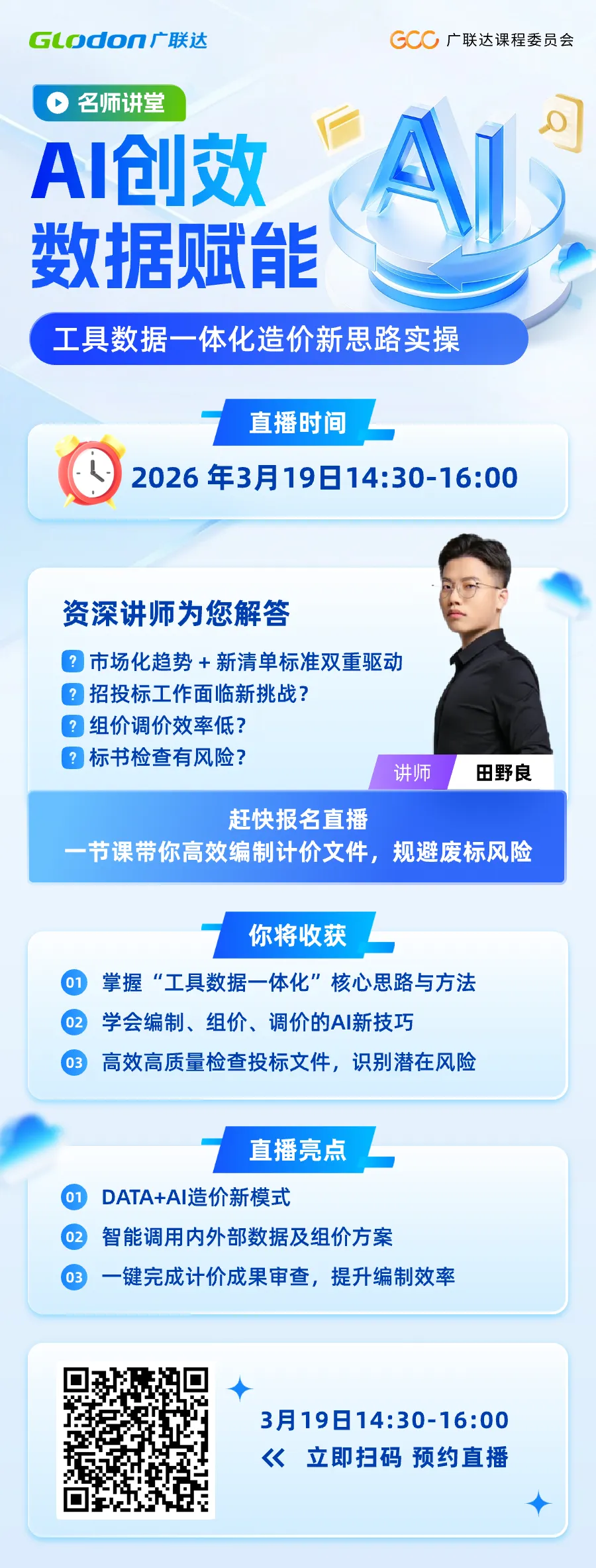 AI创效,数据赋能!工具数据一体化造价新思路实操 市场化趋势 + 新清单标准双重驱动 招投标工作面临新挑战? 组价调价效率低? 标书检查有风险? …… 别慌,3月19日14:30来直播间 AI创效,数据赋能 工具数据一体化造价新思路实操 一节课带你高效编制计价文件, 规避废标风险! 扫描二维码或点击图片即可报名听课 文案:马潇潇 编辑:王迪 审核:欧阳东