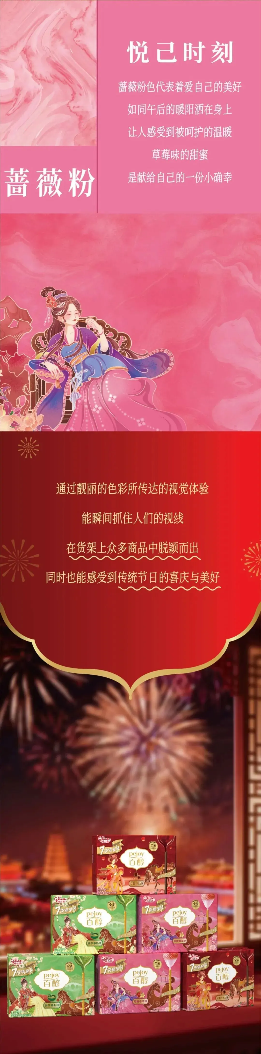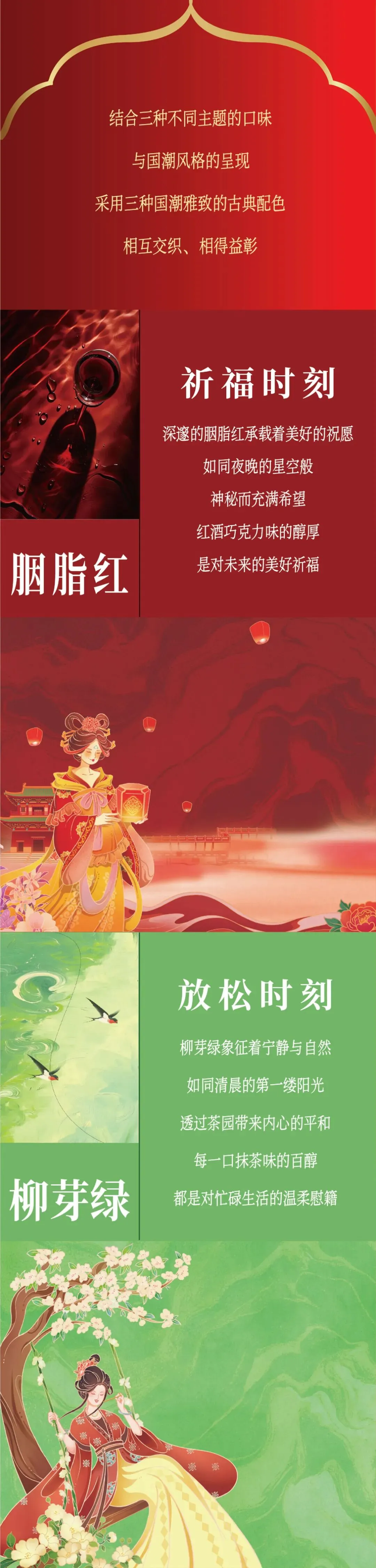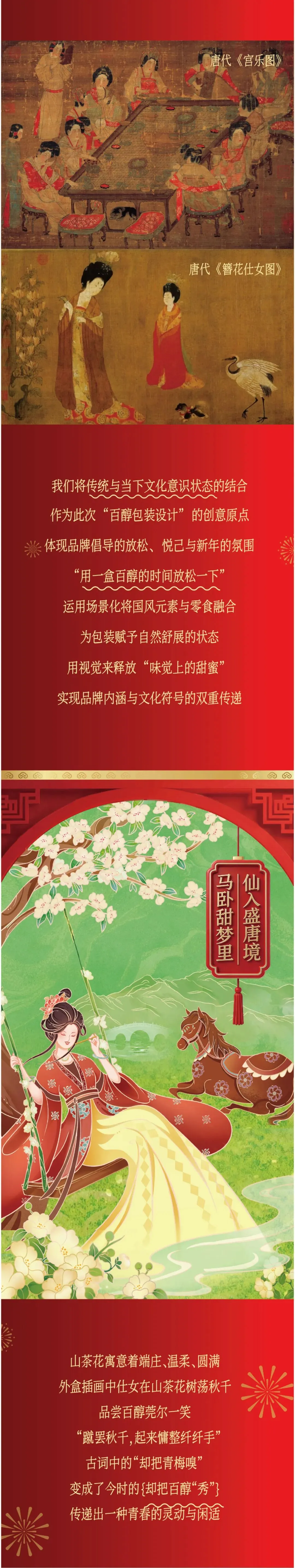 设计创意结合生肖马年并融合国风元素,用视觉来释放“味觉上的甜蜜”,为消费者打造一场别具创新的零食体验,实现品牌内涵与文化认同、情绪价值的三重传递!三款犒享装各有各的“惊喜”– 闲马游园夜、祈福映唐灯(祈福) 身着节日礼服的仕女与天灯互动,富贵牡丹相伴,酒红的香甜不断扩散,亭台楼阁,马儿闲庭漫步,将心愿托付与灯火,既有富贵雅致的美感,又藏着对美好未来的期许,满满中式浪漫的仪式感。