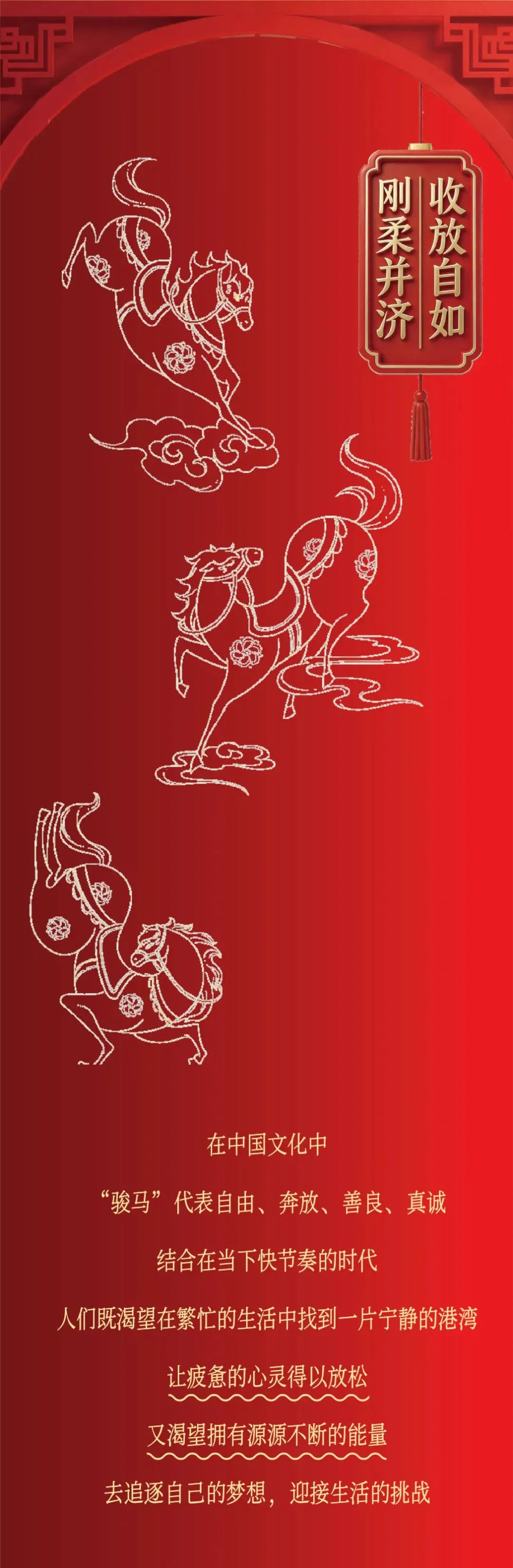 刚柔并济、收放自如 在中国文化中“骏马”代表自由、奔放、善良和真诚!结合当下快节奏的时代,人们既渴望在繁忙的生活中找到一片宁静,让心灵得以放松;又渴望拥有源源不断的能量,去追逐自己的梦想,迎接生活的挑战!