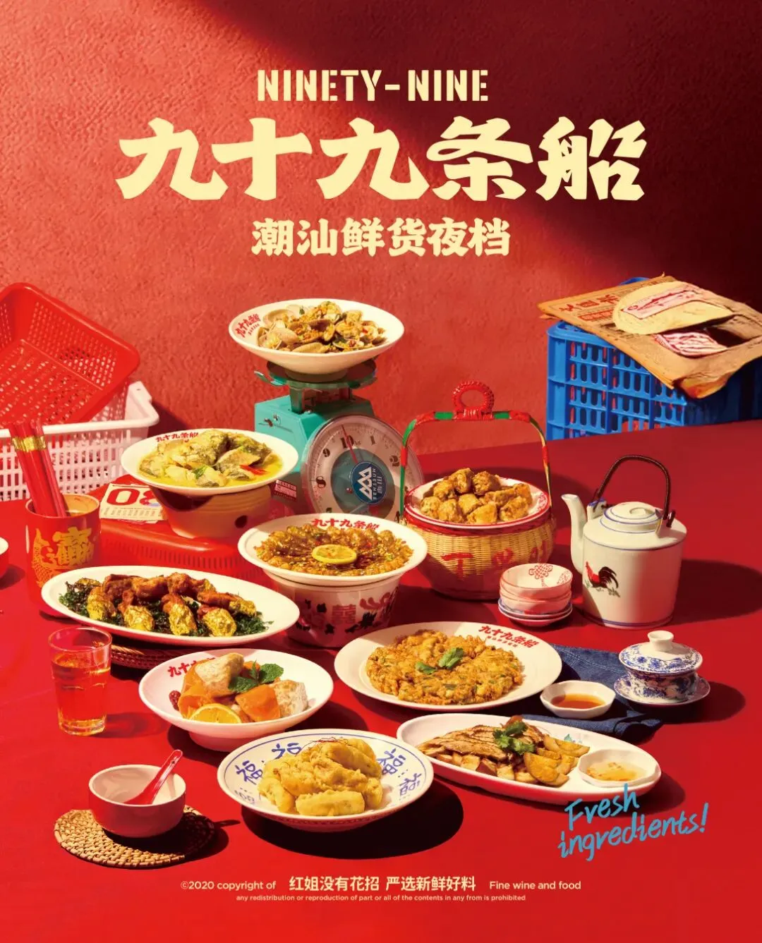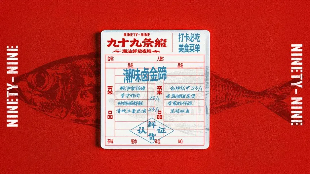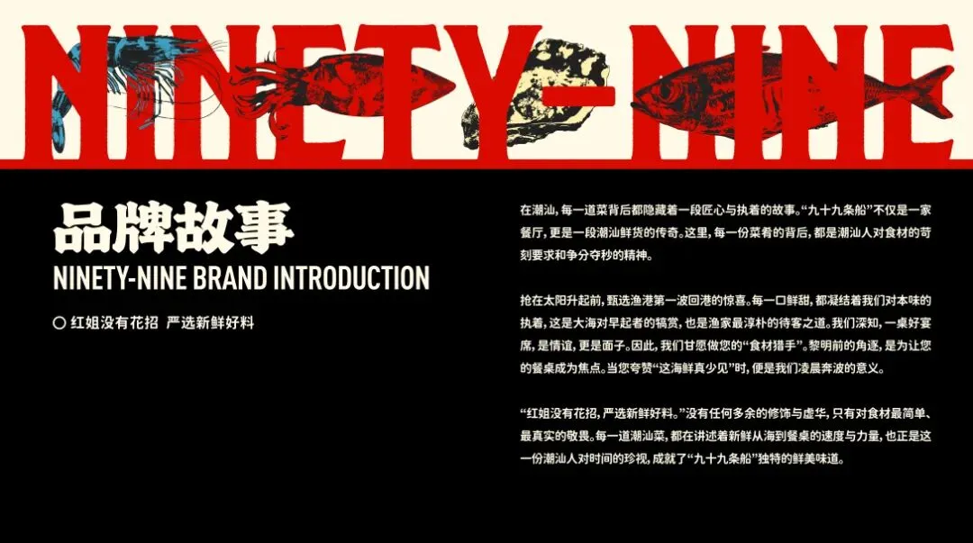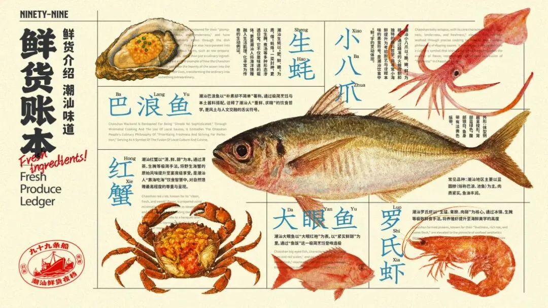 潮汕人的餐桌,从来不止是一顿饭。它是潮起潮落间渔船的归来、是抢在太阳升起前的第一网“头水货”、是潮汕人对“鲜”字近乎偏执的信仰、更是人情往来中那不动声色的体面与情谊。于是,当九十九条船以“潮汕鲜货夜档”之名登陆他乡,它带来的不只是一间餐厅,更是一整套关于“鲜”的生存哲学与视觉体系 —— 一个从海洋到餐桌的完整叙事。而这一切,都从设计开始。