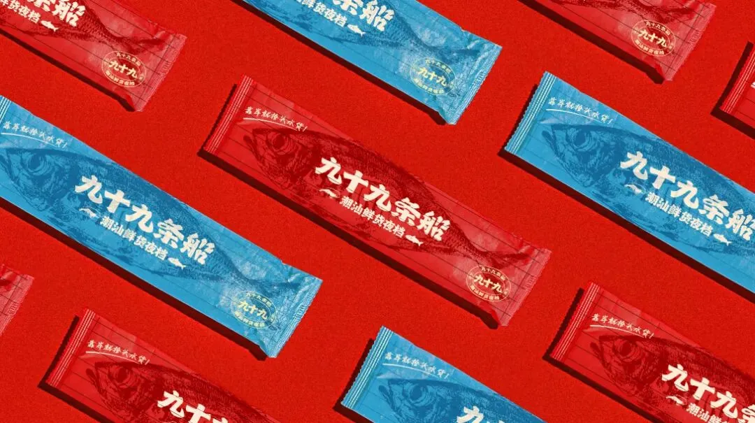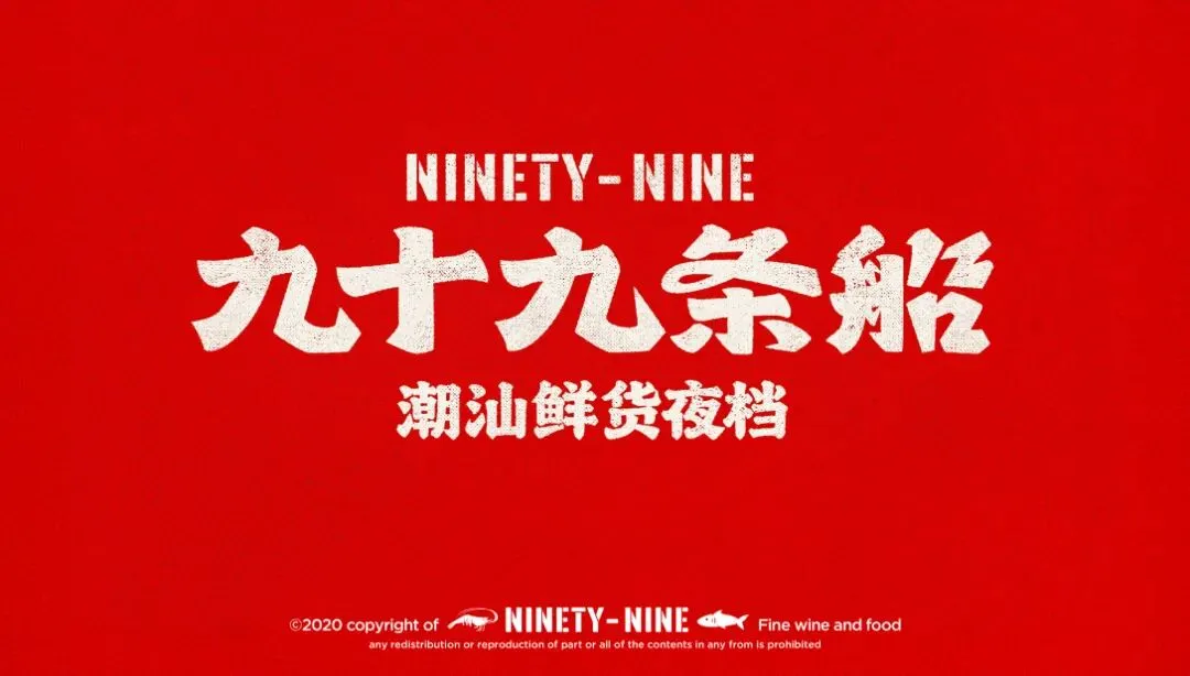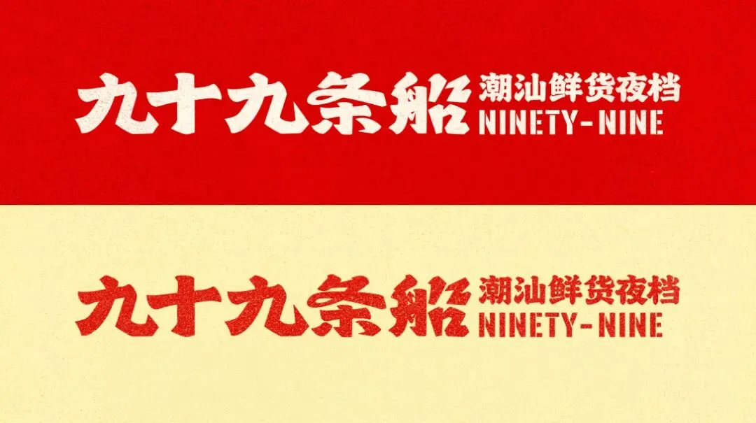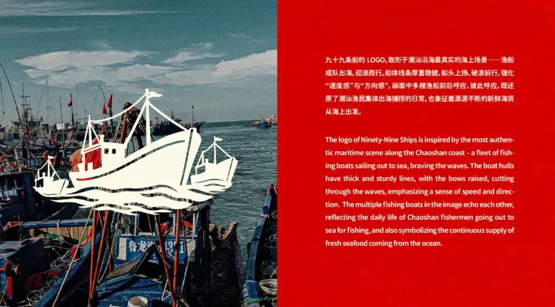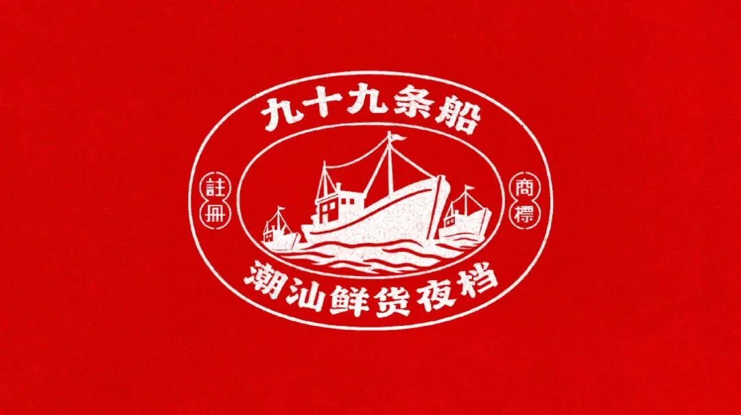 九十九条船的LOGO取形于渔船结队出海、迎浪而行的场景:船体线条厚重稳健而船头上扬,强化’速度感’与’方向感’,象征着每日新鲜海货不断从海上奔赴城市。LOGO字体融合了潮汕渔船号与灯笼字的特征,笔触间保留了渔民手刷字的粗砺与顿挫,仿佛由船工挥刷蘸漆一笔写成,携带着海风的直率与底气。