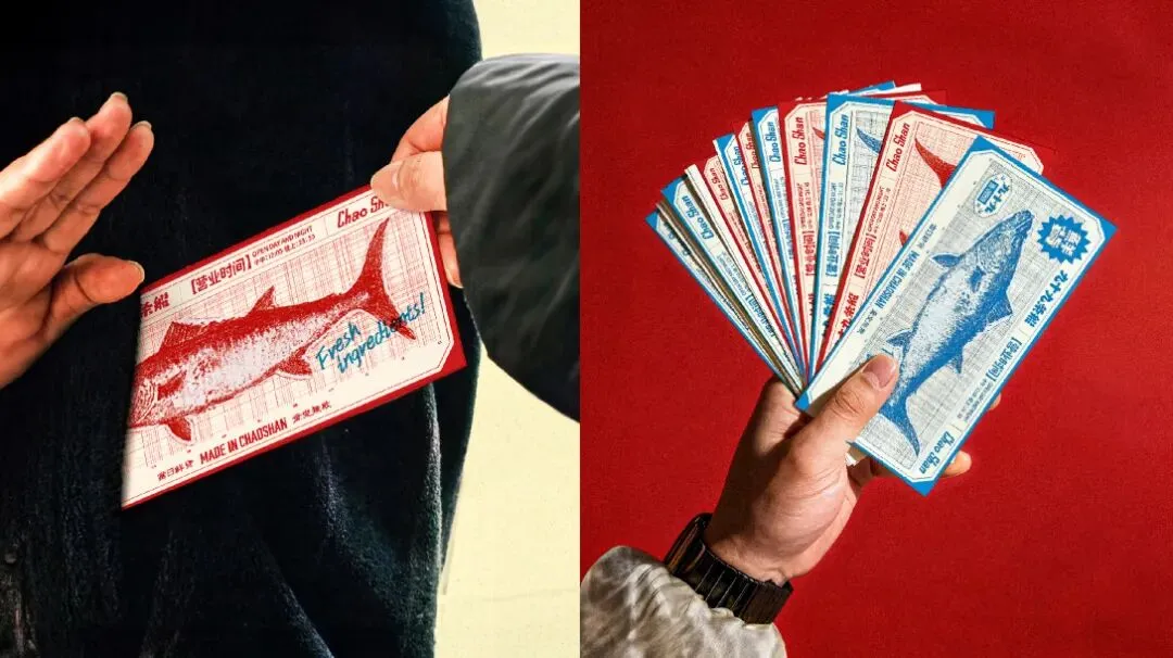 色彩体系提取自渔市交易中最具信用感的“水票”,以老船票上的朱砂红为主色,辅以水票黄与水票蓝,在视觉上承载了传统渔市的契约精神与市井喜气。