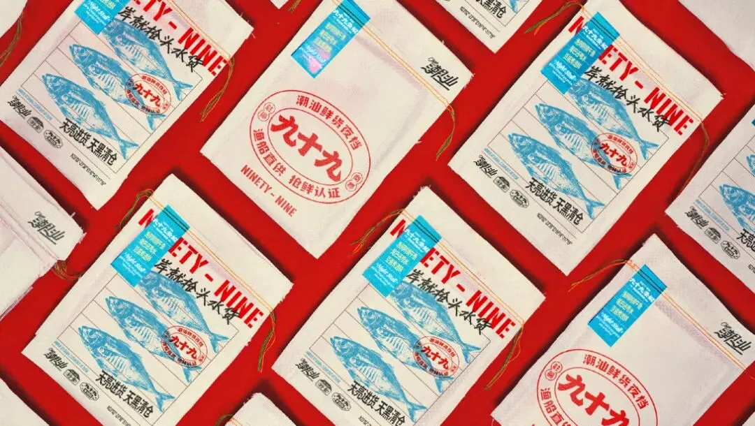 辅助图形与图标,则从潮汕旧式招牌中汲取灵感,融入现代极简线条,形成品牌独有的“新潮式”符号系统。搭配品牌专属的鱼拓插图做设计延展,进一步凸显产品的真实质感与鲜活气息。