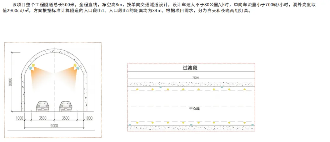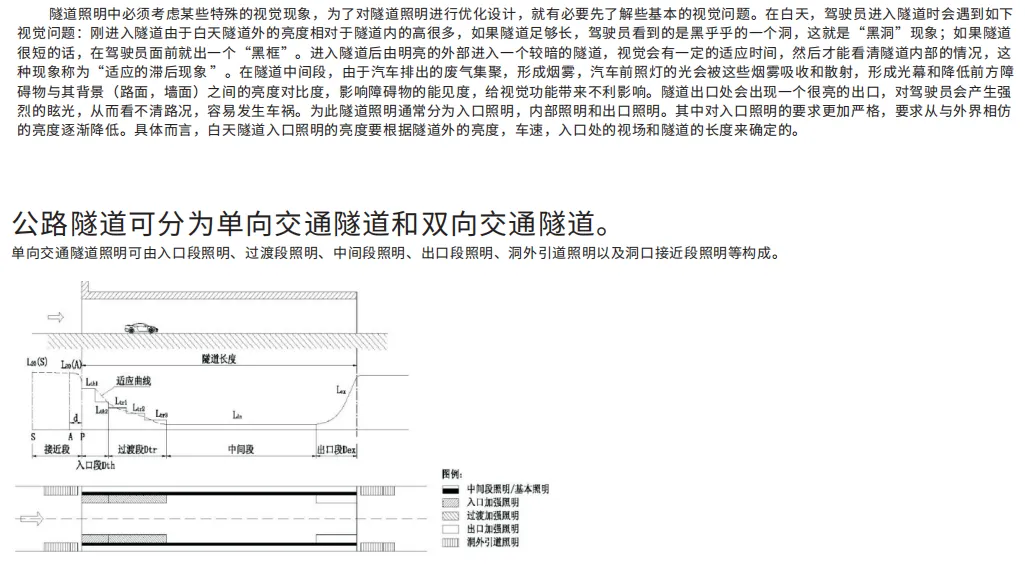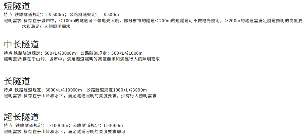 公路隧道照明说明 隧道是埋置于地层内的工程建筑物,是人类利用地下空间的一种形式。从长度上划分为短隧道、中长隧道、长隧道和特长隧道。隧道照明可以改善隧道内路面状况,改善隧道内视觉享受,减轻驾驶员疲劳,有利于提高隧道通行能力保证交通安全。