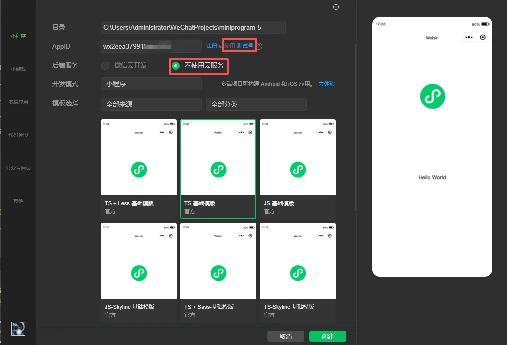 不使用云服务。模板选择,TS-基础模板。