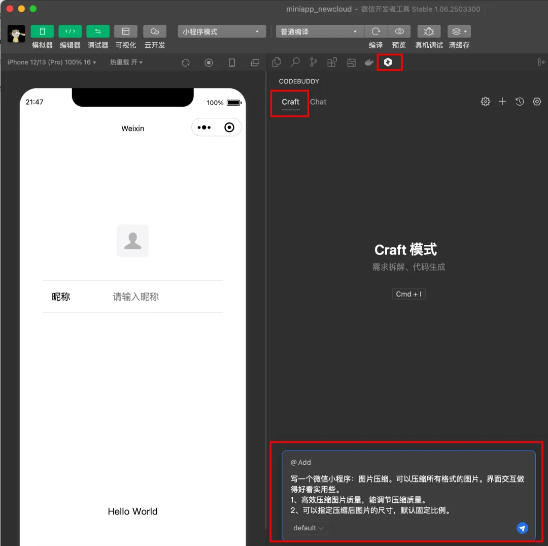 点击 code buddy,选择craft模式,输入你的需求。以一个图片压缩小程序为例。